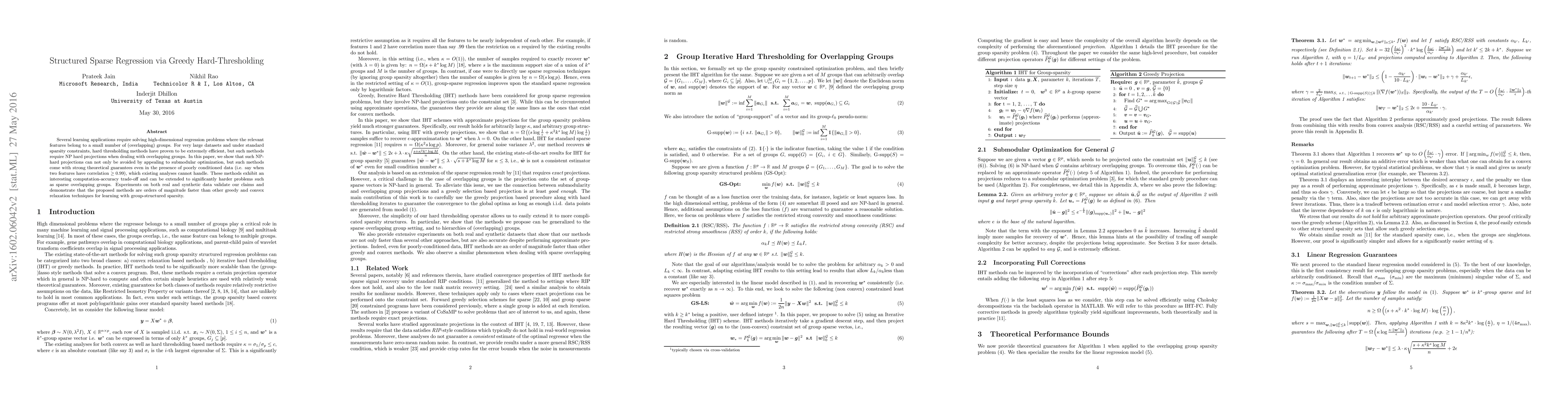 This paper proposes a structured sparse regression method using greedy hard-thresholding that leverages submodular optimization to avoid NP-hard projections for overlapping groups, offering strong theoretical guarantees even for poorly conditioned data. Experiments show the method is significantly faster than existing techniques.