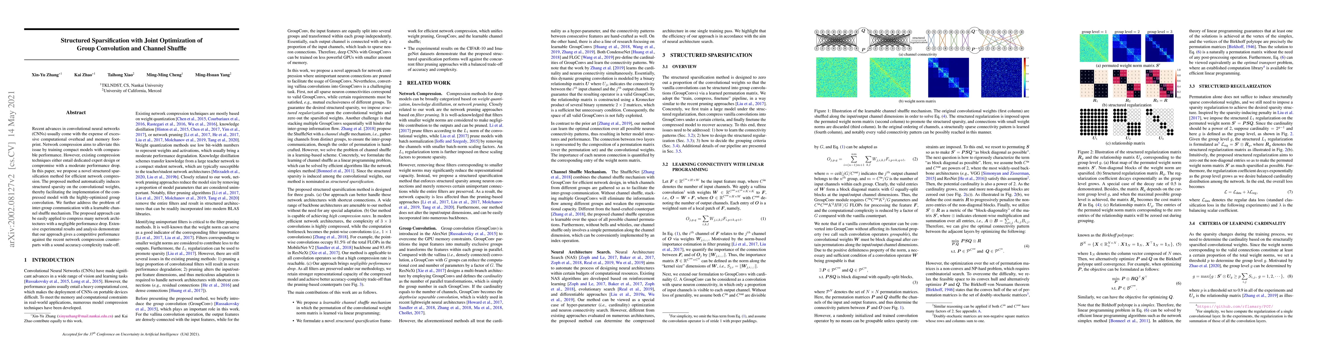 This paper proposes a novel structured sparsification method for efficient network compression that induces sparsity in convolutional weights, enabling optimized group convolution. It also integrates a learnable channel shuffle mechanism to address inter-group communication issues, achieving competitive performance with minimal accuracy loss.