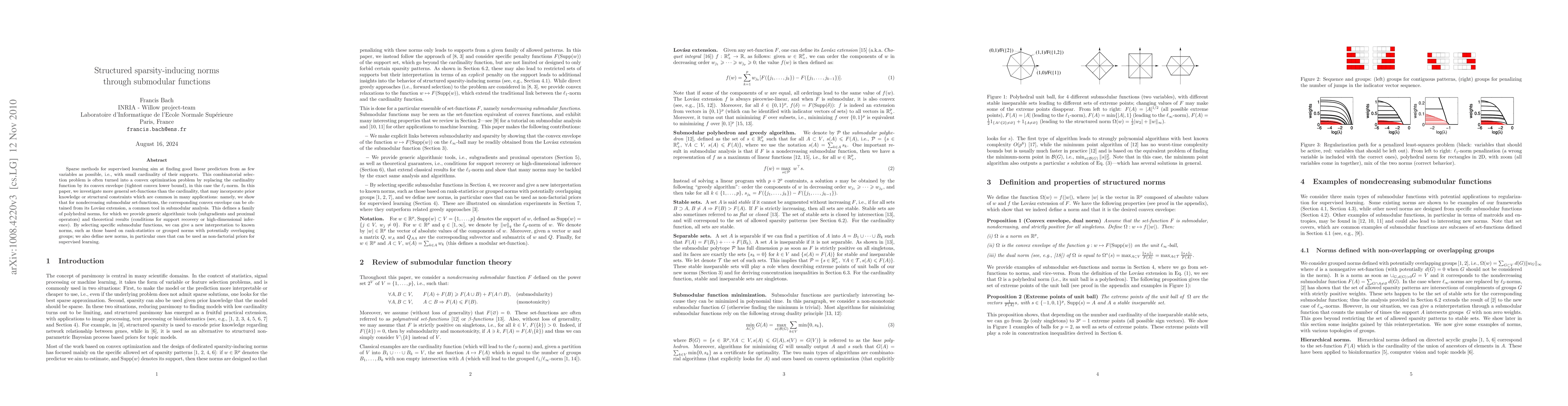 This paper explores structured sparsity-inducing norms through nondecreasing submodular functions, providing convex envelopes derived from their \lova extension. It introduces polyhedral norms with algorithmic tools and theoretical guarantees for support recovery and high-dimensional inference.