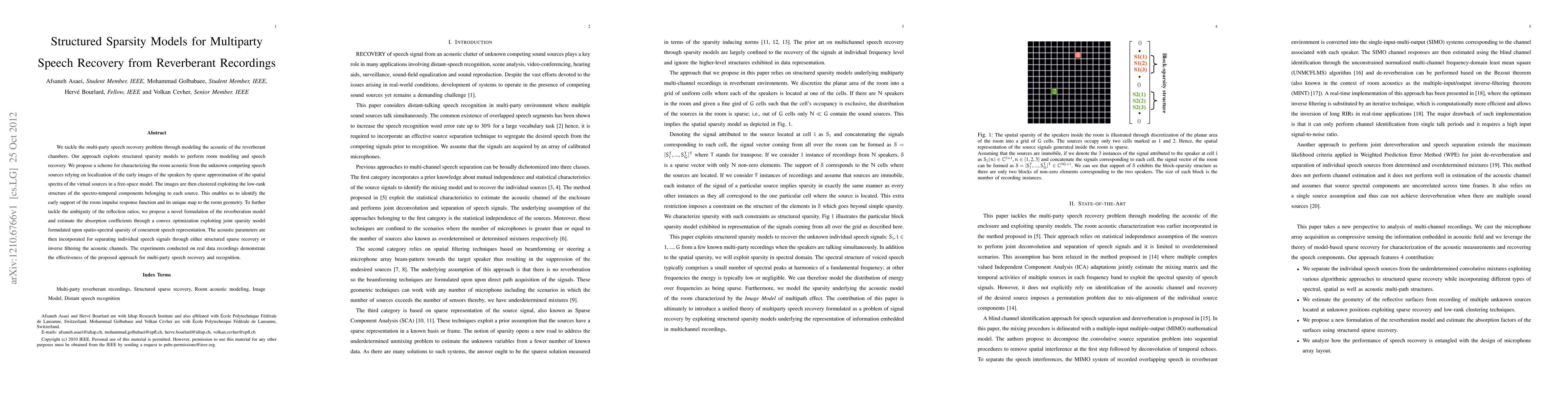This paper proposes structured sparsity models to tackle multi-party speech recovery from reverberant recordings by characterizing room acoustics through localization of early speaker images. The approach leverages clustering of low-rank spectro-temporal components and convex optimization for reverberation modeling and absorption coefficient estimation, ultimately achieving effective speech separation.