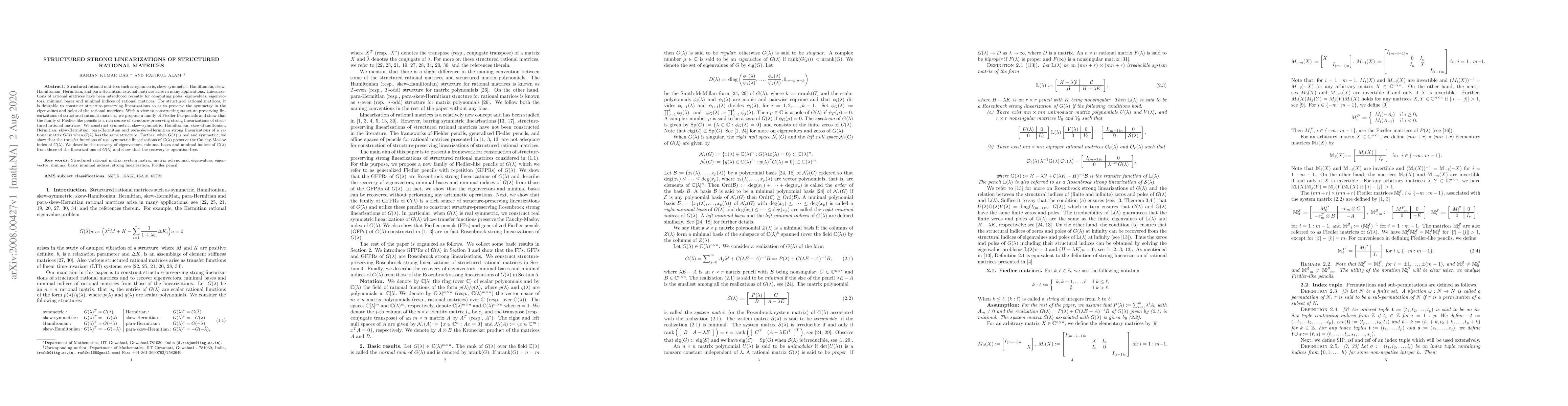 This paper proposes a family of Fiedler-like pencils for constructing structure-preserving strong linearizations of various structured rational matrices, including symmetric, Hermitian, and Hamiltonian types. It demonstrates that these linearizations preserve the original structure and the Cauchy-Maslov index for real symmetric matrices, and provides an operation-free method for recovering eigenvectors and minimal indices.