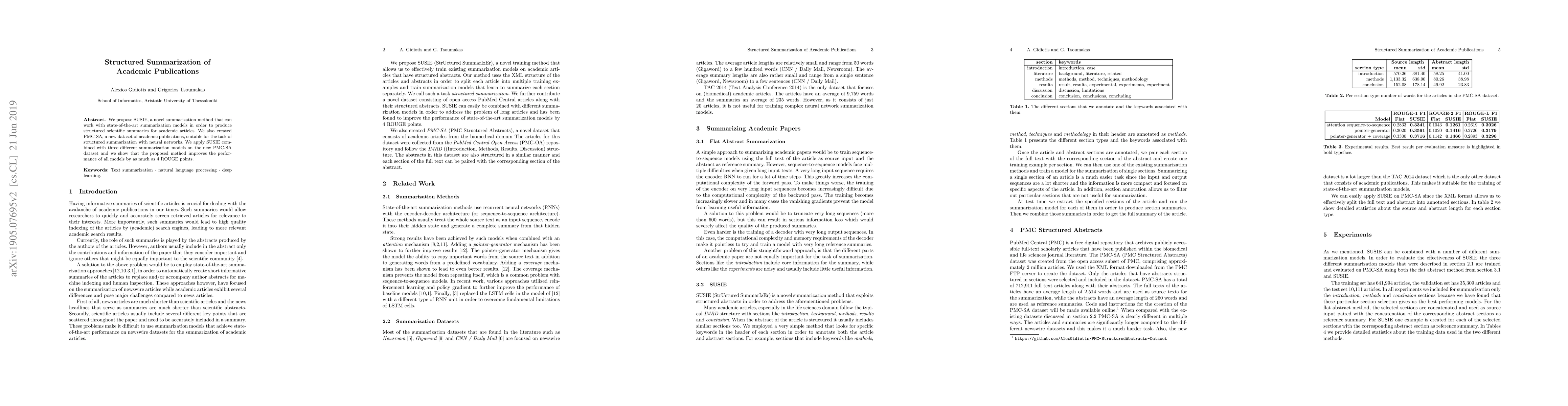 We propose SUSIE, a novel summarization method that can work with state-of-the-art summarization models in order to produce structured scientific summaries for academic articles. We also created PMC-SA, a new dataset of academic publications, suitable for the task of structured summarization with neural networks. We apply SUSIE combined with three different summarization models on the new PMC-SA dataset and we show that the proposed method improves the performance of all models by as much as 4 ROUGE points.