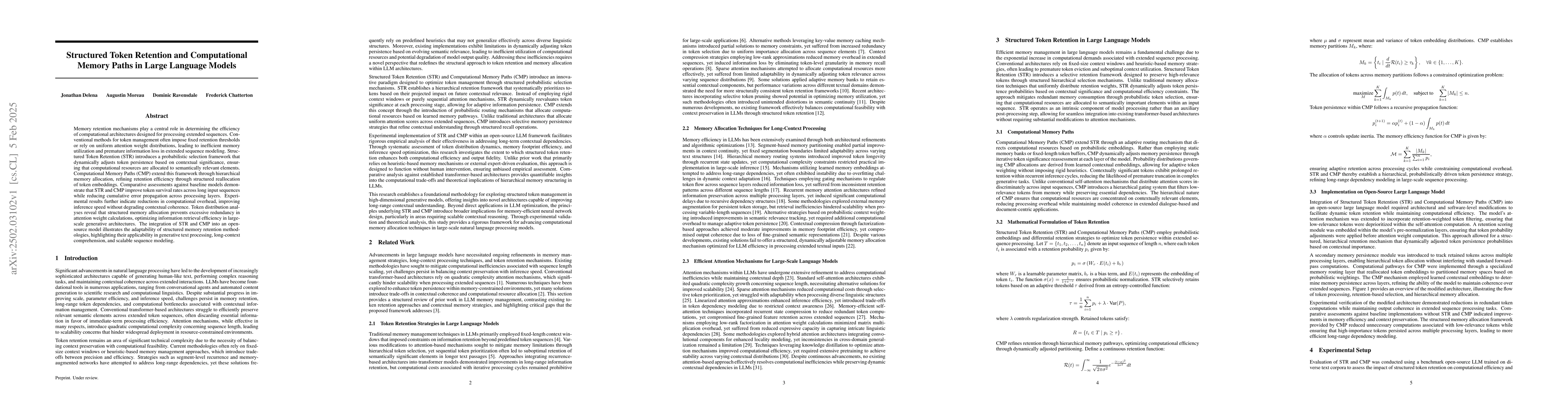 This paper proposes Structured Token Retention (STR) and Computational Memory Paths (CMP) to enhance memory efficiency in large language models by dynamically adjusting token persistence based on contextual significance and hierarchical memory allocation, respectively. Experimental results show improved token retention, reduced error propagation, and optimized computational overhead, demonstrating the effectiveness of these methods in long-context comprehension and generative text processing.