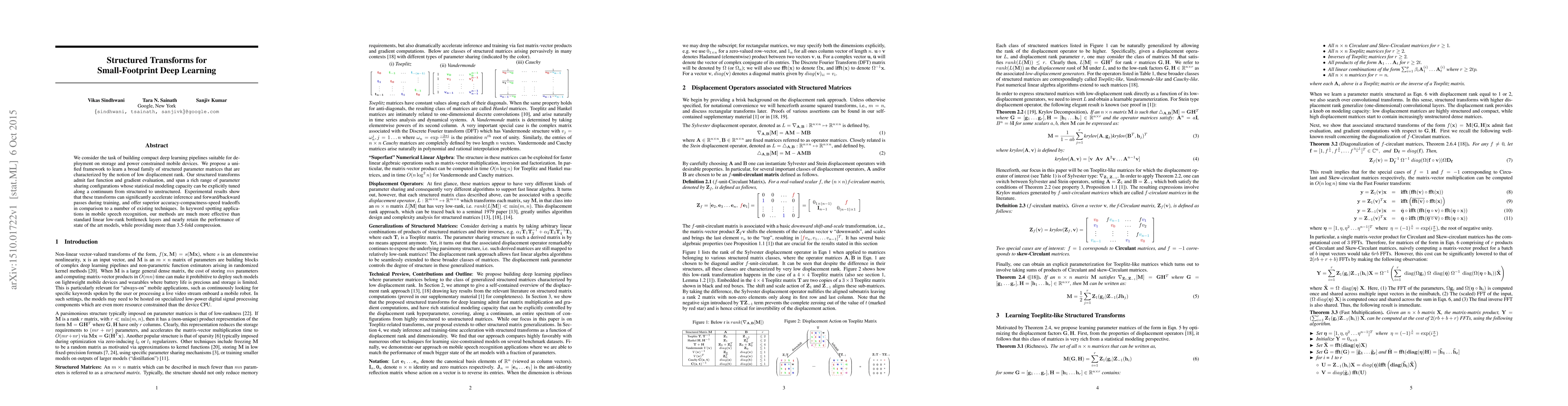 We consider the task of building compact deep learning pipelines suitable for deployment on storage and power constrained mobile devices. We propose a unified framework to learn a broad family of structured parameter matrices that are characterized by the notion of low displacement rank. Our structured transforms admit fast function and gradient evaluation, and span a rich range of parameter sharing configurations whose statistical modeling capacity can be explicitly tuned along a continuum from structured to unstructured. Experimental results show that these transforms can significantly accelerate inference and forward/backward passes during training, and offer superior accuracy-compactness-speed tradeoffs in comparison to a number of existing techniques. In keyword spotting applications in mobile speech recognition, our methods are much more effective than standard linear low-rank bottleneck layers and nearly retain the performance of state of the art models, while providing more than 3.5-fold compression.