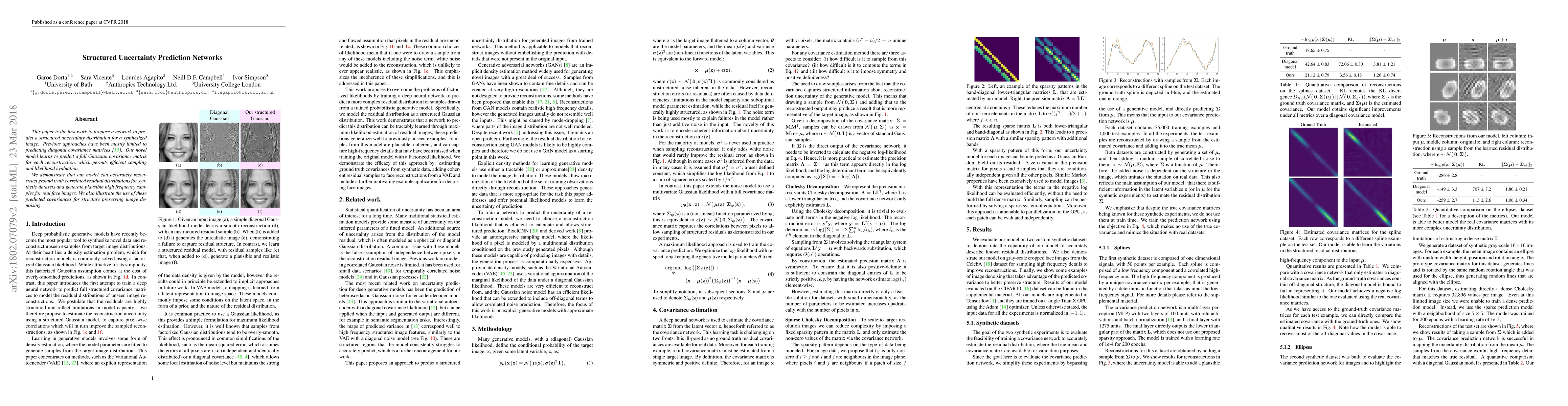 This paper introduces Structured Uncertainty Prediction Networks, which predict full Gaussian covariance matrices for image reconstructions, unlike previous methods limited to diagonal matrices. The model efficiently samples and evaluates likelihoods, accurately reconstructing synthetic datasets and denoising real face images with preserved structures.