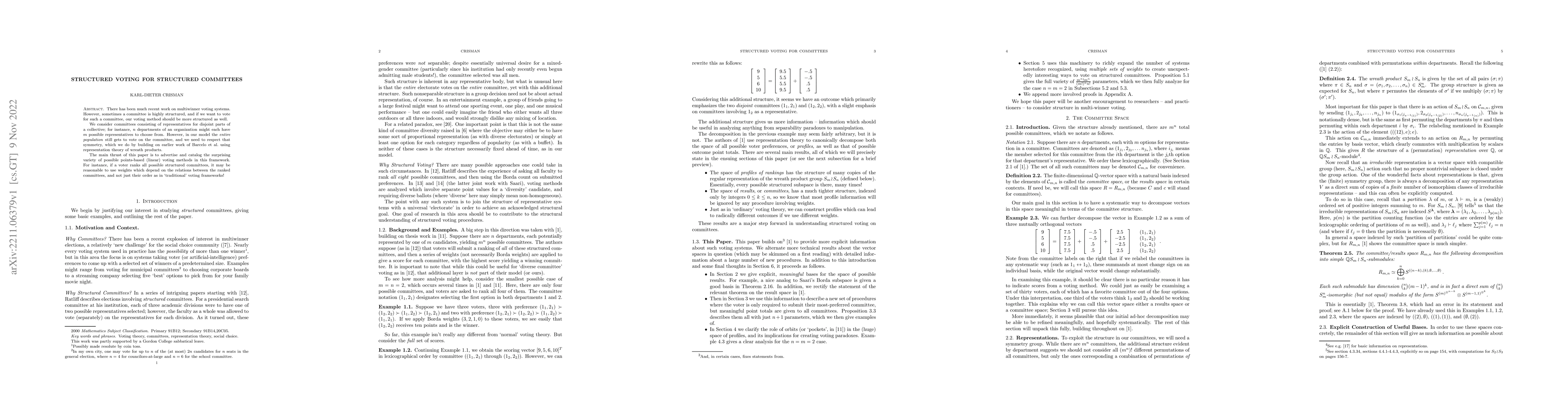 This paper explores structured voting methods for electing committees with distinct parts, such as departments in an organization, using representation theory from wreath products. It catalogs various points-based voting methods that consider relationships between ranked committees, moving beyond traditional linear voting frameworks.