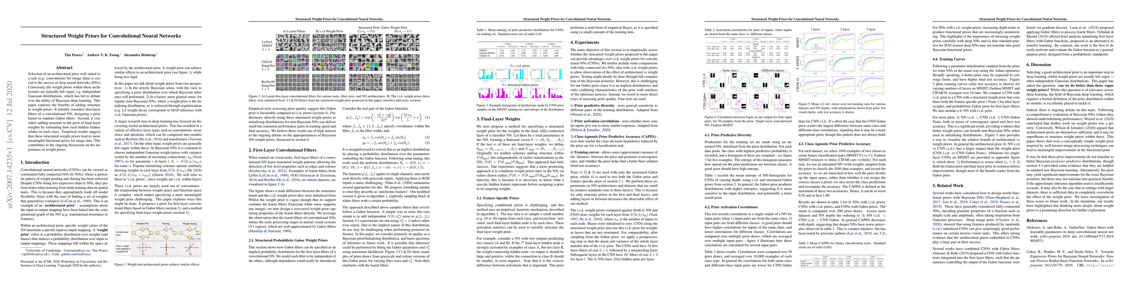 This paper investigates the benefits of structured weight priors in convolutional neural networks, proposing priors based on random Gabor filters for first-layer filters and class-related priors for final-layer weights. Empirical results suggest these structured priors enhance the functional relevance of the network for image data.