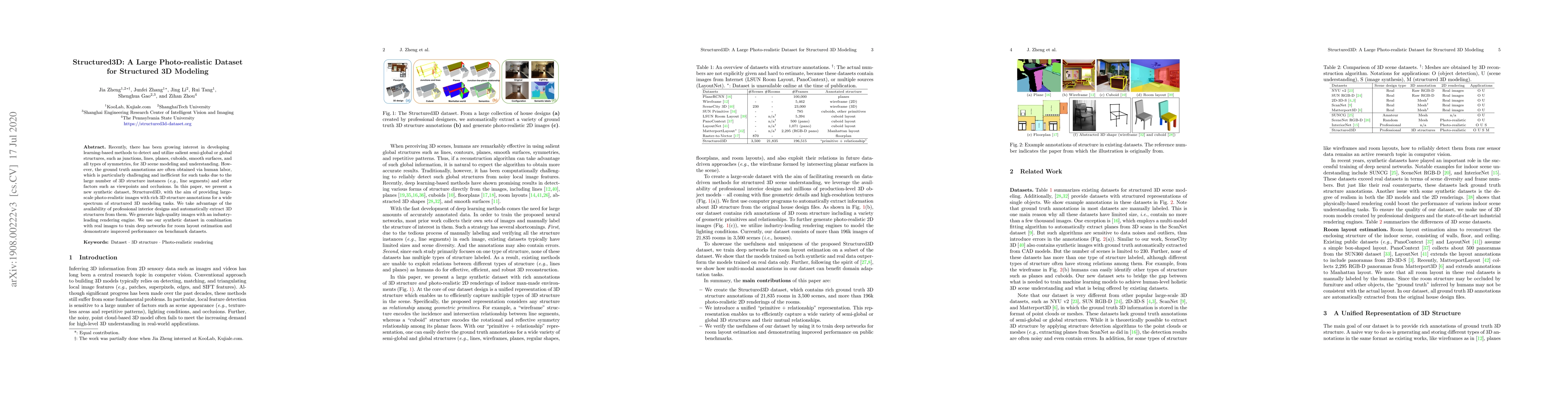 Recently, there has been growing interest in developing learning-based methods to detect and utilize salient semi-global or global structures, such as junctions, lines, planes, cuboids, smooth surfaces, and all types of symmetries, for 3D scene modeling and understanding. However, the ground truth annotations are often obtained via human labor, which is particularly challenging and inefficient for such tasks due to the large number of 3D structure instances (e.g., line segments) and other factors such as viewpoints and occlusions. In this paper, we present a new synthetic dataset, Structured3D, with the aim of providing large-scale photo-realistic images with rich 3D structure annotations for a wide spectrum of structured 3D modeling tasks. We take advantage of the availability of professional interior designs and automatically extract 3D structures from them. We generate high-quality images with an industry-leading rendering engine. We use our synthetic dataset in combination with real images to train deep networks for room layout estimation and demonstrate improved performance on benchmark datasets.