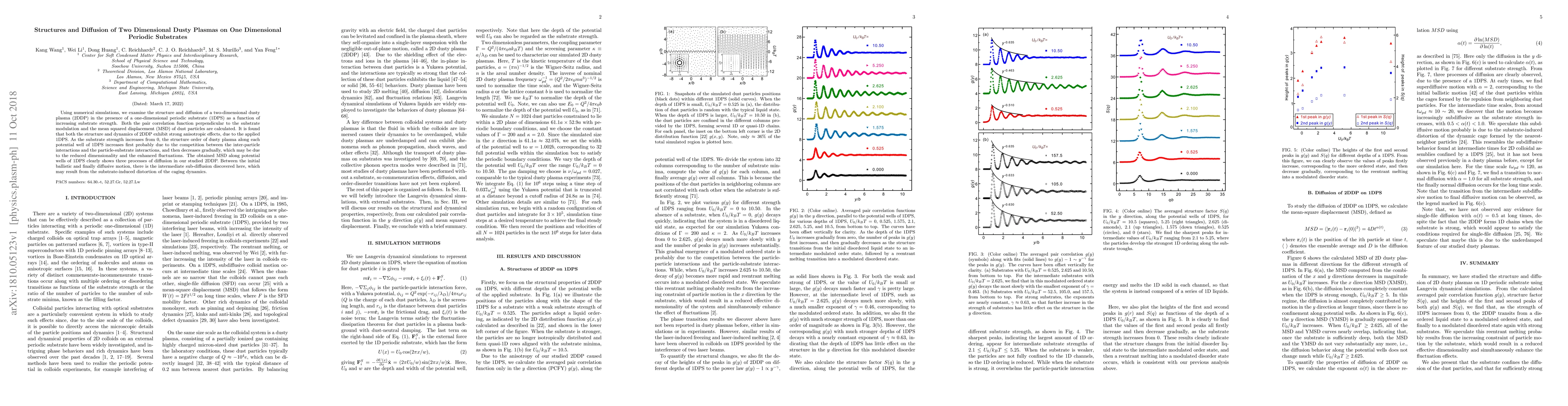 This study investigates the structure and diffusion of two-dimensional dusty plasmas on one-dimensional periodic substrates using numerical simulations. The research reveals strong anisotropic effects in the plasma's structure and dynamics, with an initial increase in order followed by a decrease as substrate strength rises, and identifies three diffusion processes including an intermediate sub-diffusion.