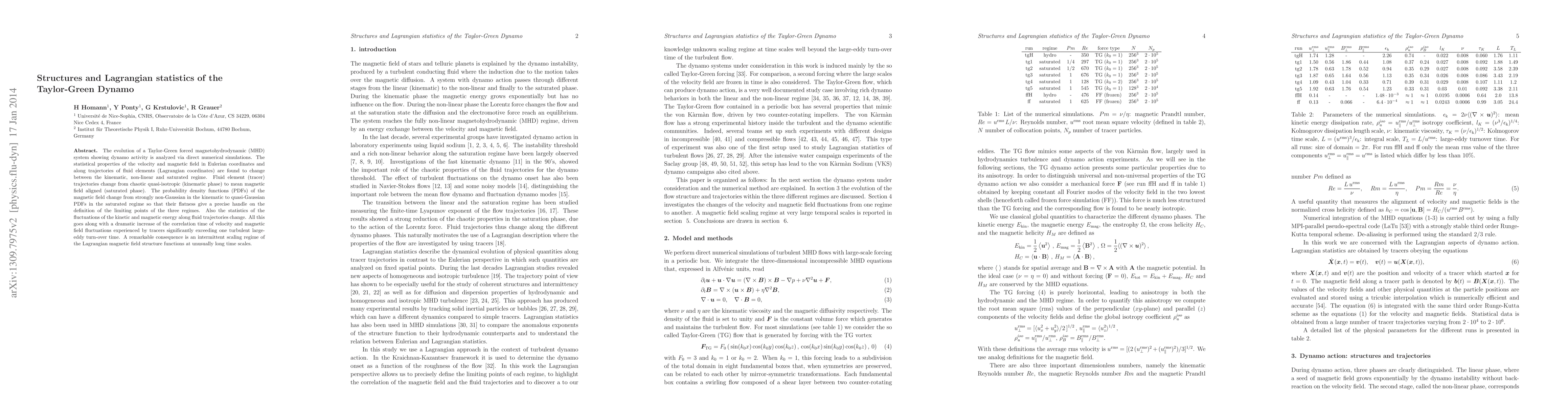 This paper analyzes the Taylor-Green dynamo's evolution through direct numerical simulations, revealing shifts in statistical properties between kinematic, non-linear, and saturated regimes. The study finds that tracer trajectories and magnetic field probability density functions transition from chaotic to aligned with the mean magnetic field, indicating a significant increase in correlation time and intermittent scaling of Lagrangian magnetic field structure functions.