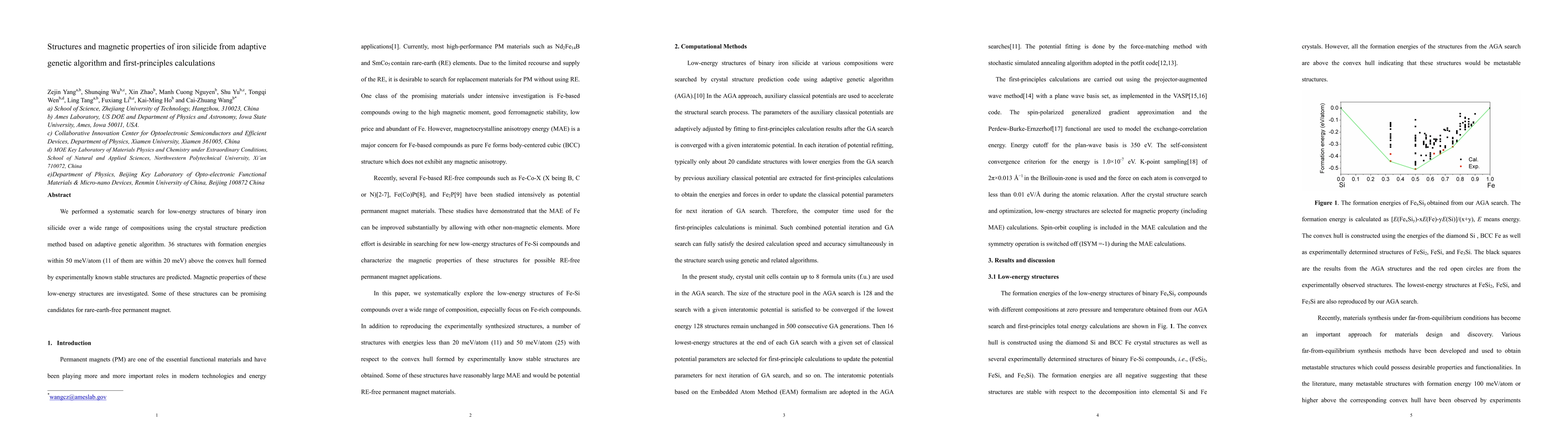 This study uses an adaptive genetic algorithm to predict 36 low-energy structures of iron silicide, with 11 within a narrow energy range above known stable forms. The research also investigates the magnetic properties, identifying potential candidates for rare-earth-free permanent magnets.