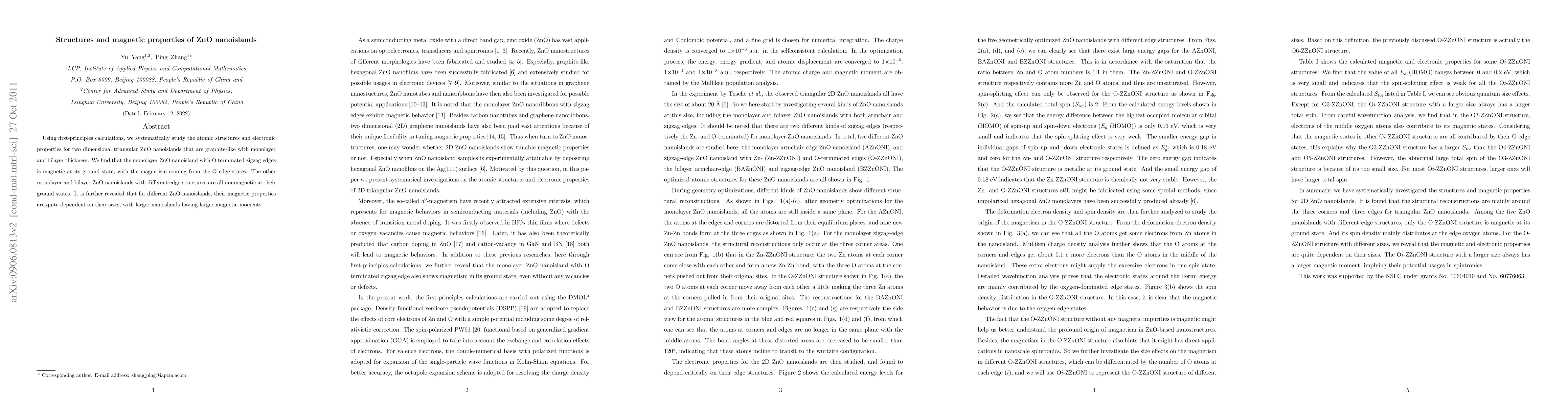 This study uses first-principles calculations to investigate the atomic and electronic properties of ZnO nanoislands. The monolayer ZnO nanoisland with O-terminated zigzag edges exhibits magnetic properties due to the O edge states, while other configurations remain nonmagnetic, highlighting size-dependent magnetic moments in larger nanoislands.