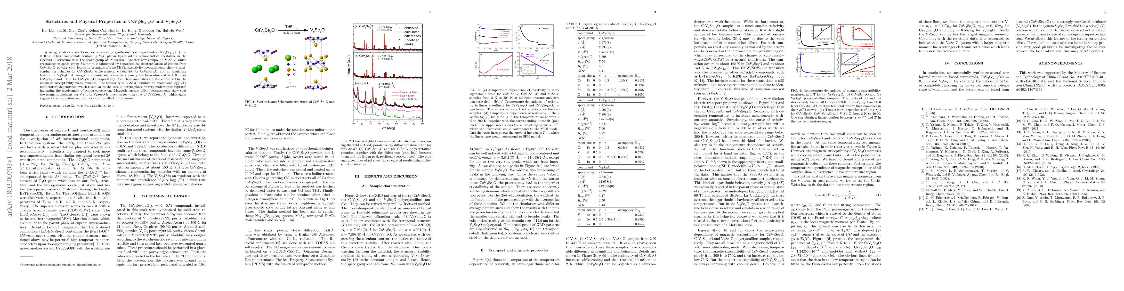 This paper synthesizes new oxyselenides CsV$_2$Se$_{2-x}$O and V$_2$Se$_2$O, revealing semiconducting, metallic, and insulating behaviors respectively, with anomalies suggesting charge- or spin-density wave phenomena. Magnetic susceptibility indicates strong correlation effects in V$_2$Se$_2$O.
