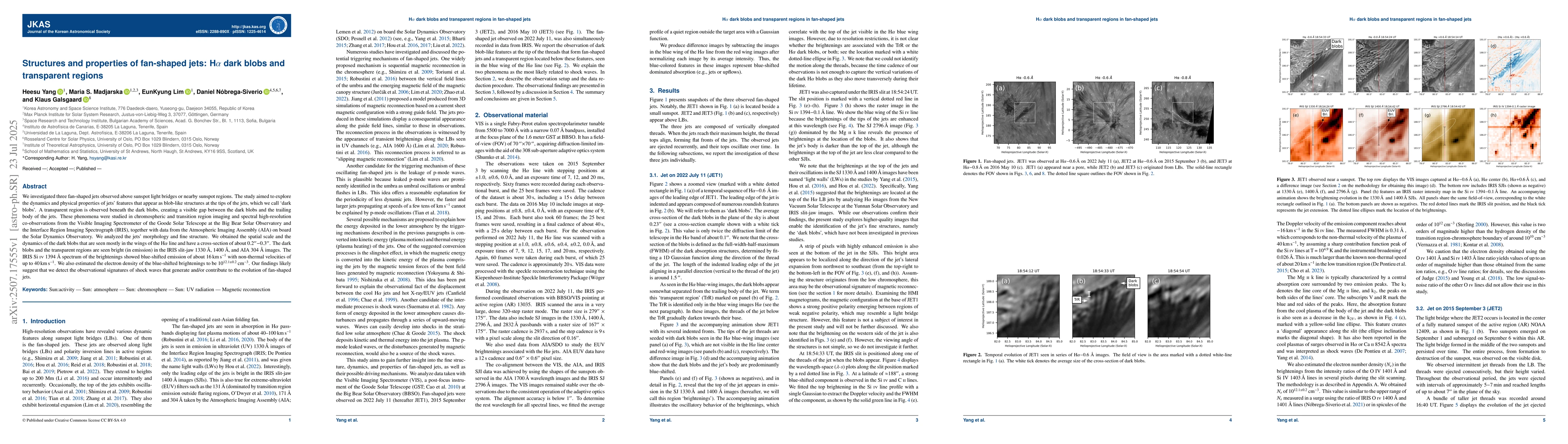 We investigated three fan-shaped jets observed above sunspot light bridges or nearby sunspot regions. The study aimed to explore the dynamics and physical properties of jets' features that appear as blob-like structures at the tips of the jets, which we call `dark blobs'. A transparent region is observed beneath the dark blobs, creating a visible gap between the dark blobs and the trailing body of the jets. These phenomena were studied in chromospheric and transition region imaging and spectral high-resolution co-observations from the Visible Imaging Spectrometer of the Goode Solar Telescope at the Big Bear Solar Observatory and the Interface Region Imaging Spectrograph (IRIS), together with data from the Atmospheric Imaging Assembly (AIA) on board the Solar Dynamics Observatory. We analyzed the jets' morphology and fine structure. We obtained the spatial scale and the dynamics of the dark blobs that are seen mostly in the wings of the H$\alpha$ line and have a cross-section of about $0.2^{\prime\prime}-0.3^{\prime\prime}$. The dark blobs and the transparent regions are seen bright (in emission) in the IRIS slit-jaw 1330 $\unicode{0x212B}$, 1400 $\unicode{0x212B}$, and AIA 304 $\unicode{0x212B}$ images. The IRIS Si IV 1394 $\unicode{0x212B}$ spectrum of the brightenings showed blue-shifted emission of about $16$ km s$^{-1}$ with non-thermal velocities of up to $40$ km s$^{-1}$. We also estimated the electron density of the blue-shifted brightenings to be $10^{12.1\pm0.2}$ cm$^{-3}$. Our findings likely suggest that we detect the observational signatures of shock waves that generate and/or contribute to the evolution of fan-shaped jets.