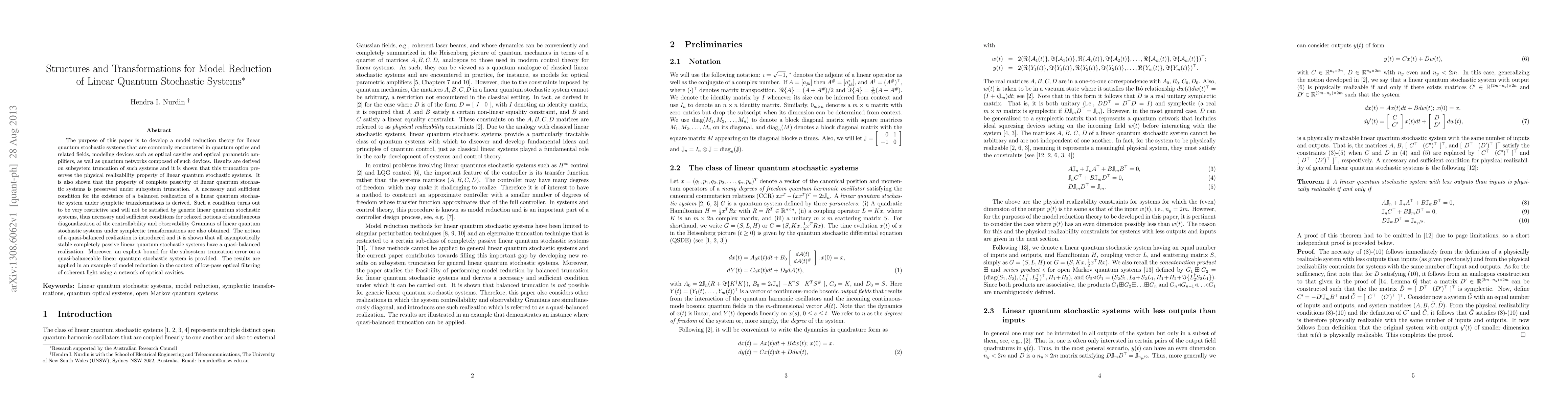 This paper develops a model reduction theory for linear quantum stochastic systems, focusing on preserving physical realizability and complete passivity through subsystem truncation. It introduces quasi-balanced realizations and provides an explicit error bound for subsystem truncation, applied to low-pass optical filtering.