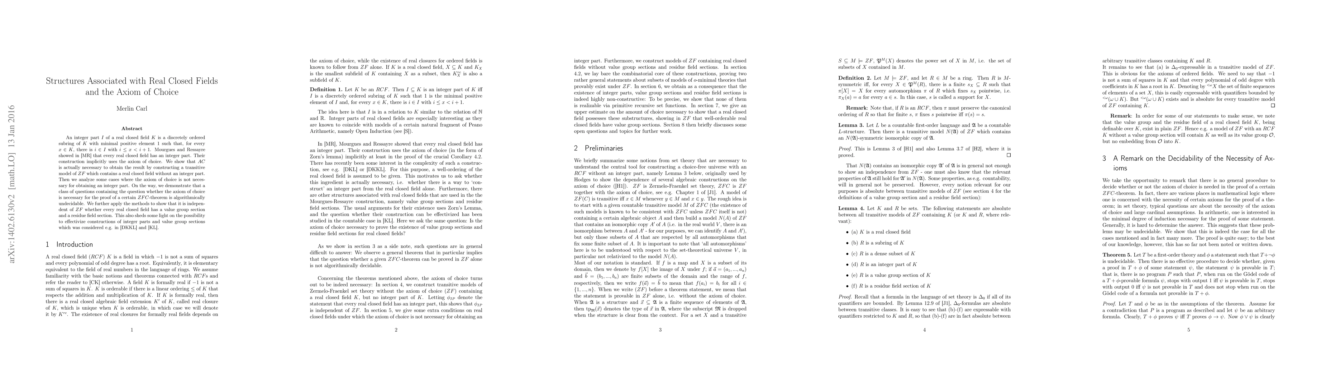An integer part I of a real closed field K is a discretely ordered subring with minimal element 1 such that, for every x in K, I contains some i such that x is between i and i+1 in the ordering of K. Mourgues and Ressayre showed that every real closed field has an integer part. Their construction implicitely uses the axiom of choice. We show that the axiom of choice is actually necessary to obtain the result by constructing a transitive model of ZF (i.e. set theory without the axiom of choice) which contains a real closed field without an integer part. Then we analyze some cases where the axiom of choice is not necessary for obtaining an integer part. An integer part I of a real closed field K is a discretely ordered subring of K with minimal positive element 1 such that, for every x in K, I contains some i such that x is between i and i+1 in the ordering of K. Mourgues and Ressayre showed that every real closed field has an integer part. Their construction implicitly uses the axiom of choice. We show that the axiom of choice is actually necessary to obtain the result by constructing a transitive model of ZF (i.e. set theory without the axiom of choice) which contains a real closed field without an integer part. Then we analyze some cases where the axiom of choice is not necessary for obtaining an integer part. On the way, we demonstrate that a class of questions containing the question whether the axiom of choice is necessary for the proof of a certain ZFC-theorem is algorithmically undecidable. We further apply the methods to show that it is independent of ZF whether every real closed field has a value group section and a residue field section. This also sheds some light on the possibility to effectivize constructions of integer parts.