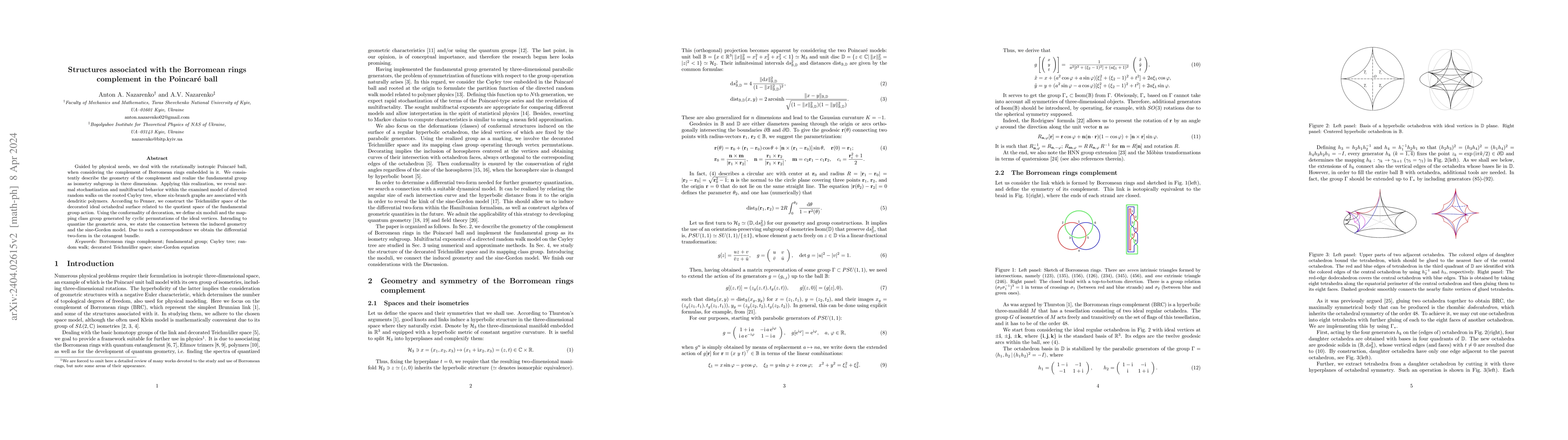 Guided by physical needs, we deal with the rotationally isotropic Poincar\'e ball, when considering the complement of Borromean rings embedded in it. We consistently describe the geometry of the complement and realize the fundamental group as isometry subgroup in three dimensions. Applying this realization, we reveal normal stochastization and multifractal behavior within the examined model of directed random walks on the rooted Cayley tree, whose six-branch graphs are associated with dendritic polymers. According to Penner, we construct the Teichm\"uller space of the decorated ideal octahedral surface related to the quotient space of the fundamental group action. Using the conformality of decoration, we define six moduli and the mapping class group generated by cyclic permutations of the ideal vertices. Intending to quantize the geometric area, we state the connection between the induced geometry and the sine-Gordon model. Due to such a correspondence we obtain the differential two-form in the cotangent bundle.