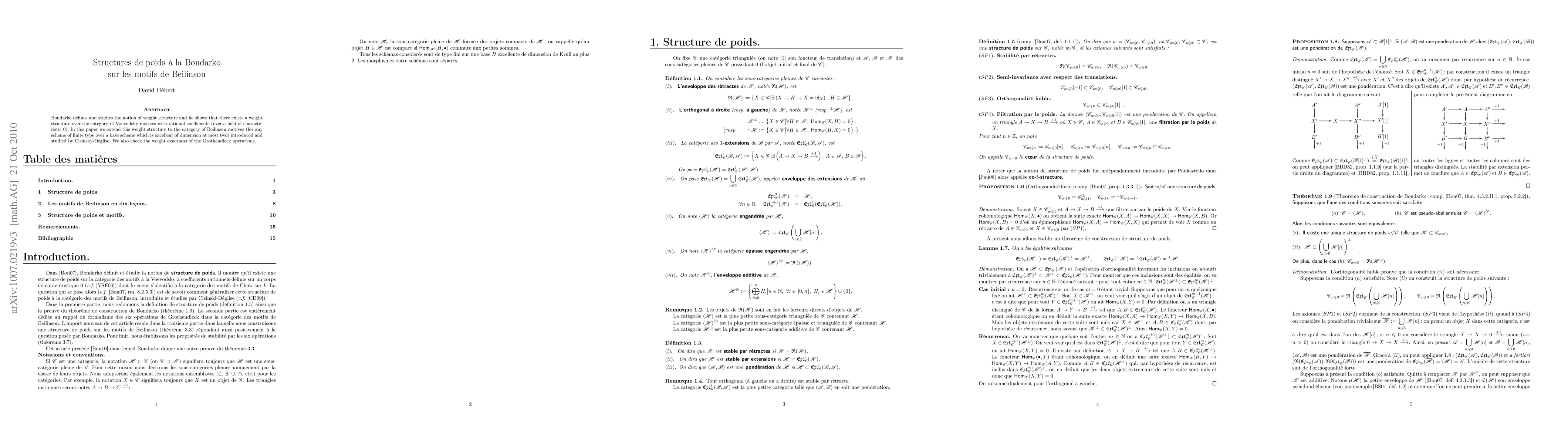 In [Bon07], Bondarko defines and studies the notion of weight structure and he shows that there exist a weight structure over the category of Voevodsky motives with rationals coefficients (over a field of characteristic 0). In this paper we extend this weight structure to the category of Beilinson motives (for any scheme of finite type over a base scheme which is excelent of dimension at most two) introduced and studied by Cisinsky-D\'eglise. ----- Dans [Bon07], Bondarko d\'efinit et \'etudie la notion de structure de poids et il montre qu'il existe une structure de poids sur la cat\'egorie des motifs de Voevodsky \`a coefficients rationnels (sur un corps de caract\'eristique 0). Dans cet article nous \'etendons cette structure de poids \`a la cat\'egorie des motifs de Beilinson (pour un sch\'ema de type fini sur un sch\'ema de base qui est excellent de dimension au plus deux) introduite et \'etudi\'ee par Cisinsky-D\'eglise ([CD09]).