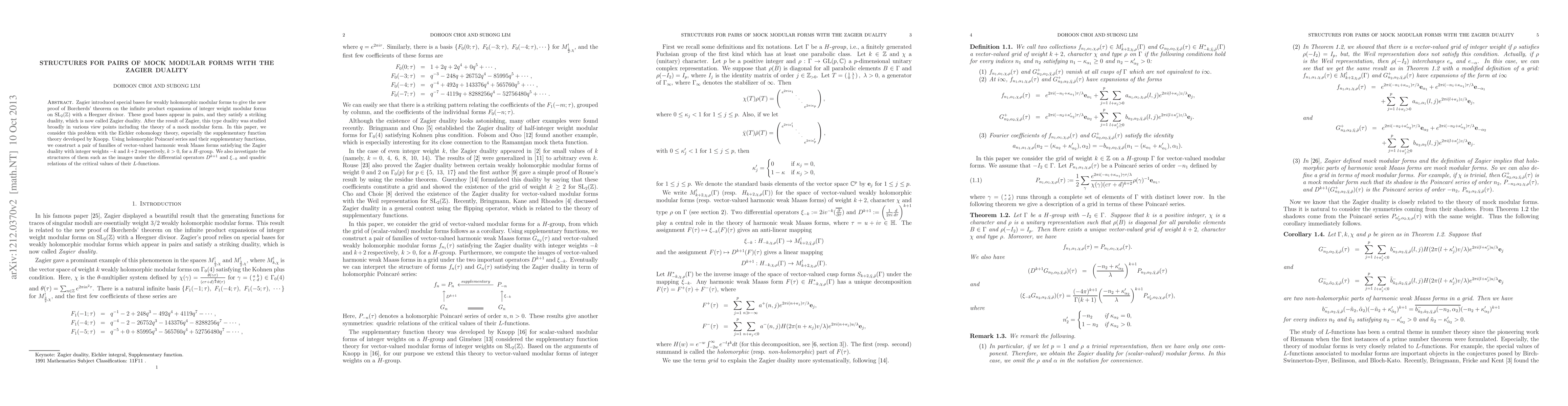 This paper explores pairs of mock modular forms and their structures, focusing on the Zagier duality within the context of Eichler cohomology and supplementary function theory. It constructs vector-valued harmonic weak Maass forms that satisfy the Zagier duality for integer weights, and investigates their properties under differential operators and the relations of their $L$-functions.