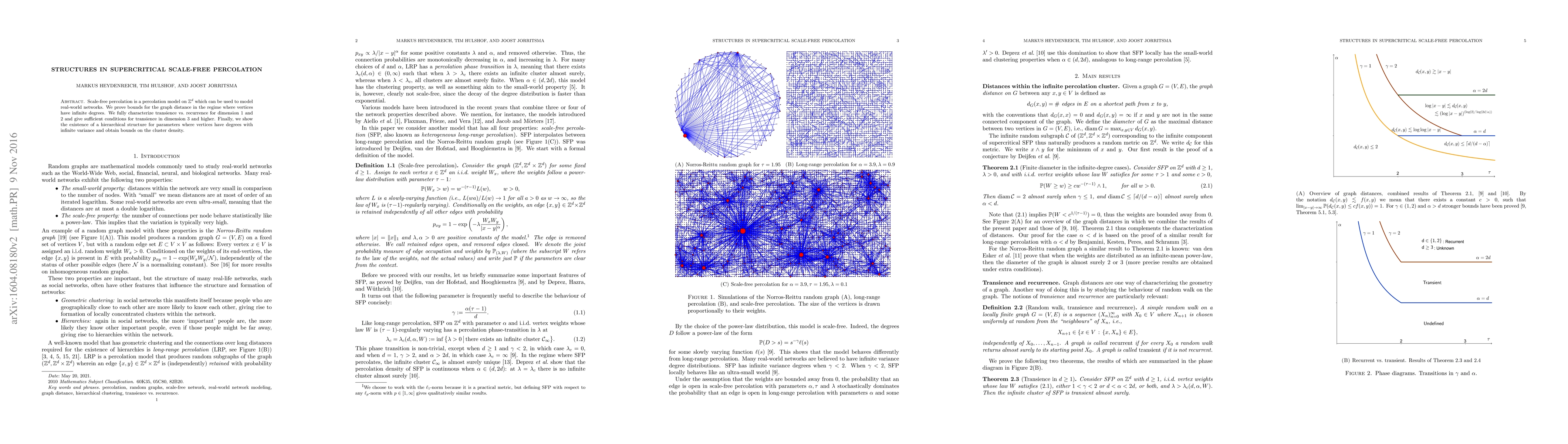 Scale-free percolation is a percolation model on $\mathbb{Z}^d$ which can be used to model real-world networks. We prove bounds for the graph distance in the regime where vertices have infinite degrees. We fully characterize transience vs. recurrence for dimension 1 and 2 and give sufficient conditions for transience in dimension 3 and higher. Finally, we show the existence of a hierarchical structure for parameters where vertices have degrees with infinite variance and obtain bounds on the cluster density.