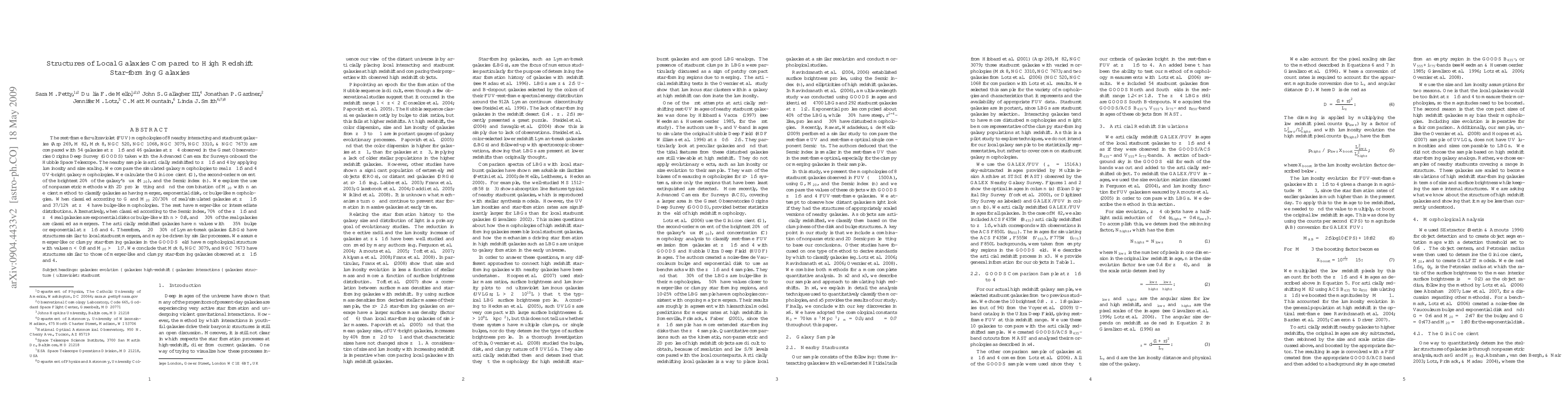 The rest-frame far-ultraviolet (FUV) morphologies of 8 nearby interacting and starburst galaxies (Arp 269, M 82, Mrk 8, NGC 520, NGC 1068, NGC 3079, NGC 3310, NGC 7673) are compared with 54 galaxies at z ~ 1.5 and 46 galaxies at z ~ 4 observed in the GOODS-ACS field. The nearby sample is artificially redshifted to z ~ 1.5 and 4. We compare the simulated galaxy morphologies to real z ~ 1.5 and 4 UV-bright galaxy morphologies. We calculate the Gini coefficient (G), the second-order moment of the brightest 20% of the galaxy's flux (M_20), and the Sersic index (n). We explore the use of nonparametric methods with 2D profile fitting and find the combination of M_20 with n an efficient method to classify galaxies as having merger, exponential disk, or bulge-like morphologies. When classified according to G and M_20, 20/30% of real/simulated galaxies at z ~ 1.5 and 37/12% at z ~ 4 have bulge-like morphologies. The rest have merger-like or intermediate distributions. Alternatively, when classified according to the Sersic index, 70% of the z ~ 1.5 and z ~ 4 real galaxies are exponential disks or bulge-like with n > 0.8, and ~30% of the real galaxies are classified as mergers. The artificially redshifted galaxies have n values with ~35% bulge or exponential at z ~ 1.5 and 4. Therefore, ~20-30% of Lyman-break galaxies (LBGs) have structures similar to local starburst mergers, and may be driven by similar processes. We assume merger-like or clumpy star-forming galaxies in the GOODS field have morphological structure with values n < 0.8 and M_20 > -1.7. We conclude that Mrk 8, NGC 3079, and NGC 7673 have structures similar to those of merger-like and clumpy star-forming galaxies observed at z ~ 1.5 and 4.
