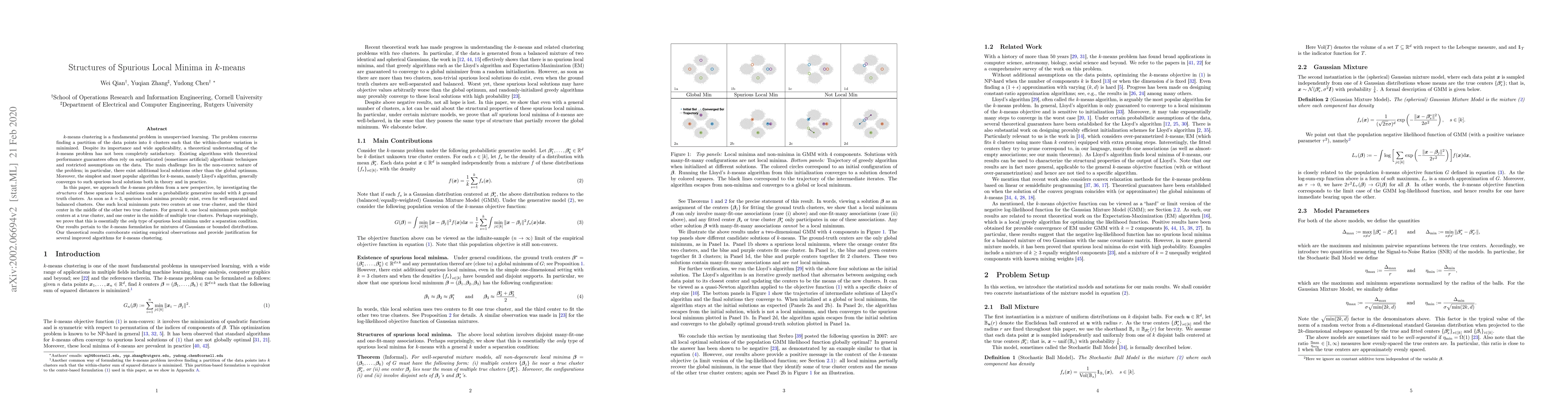 This paper explores the structures of spurious local minima in the $k$-means clustering problem, revealing that even well-separated clusters can lead to such local solutions. It identifies a specific type of spurious local minima, particularly when $k=3$ or more, and provides theoretical justification for improved $k$-means clustering algorithms.
