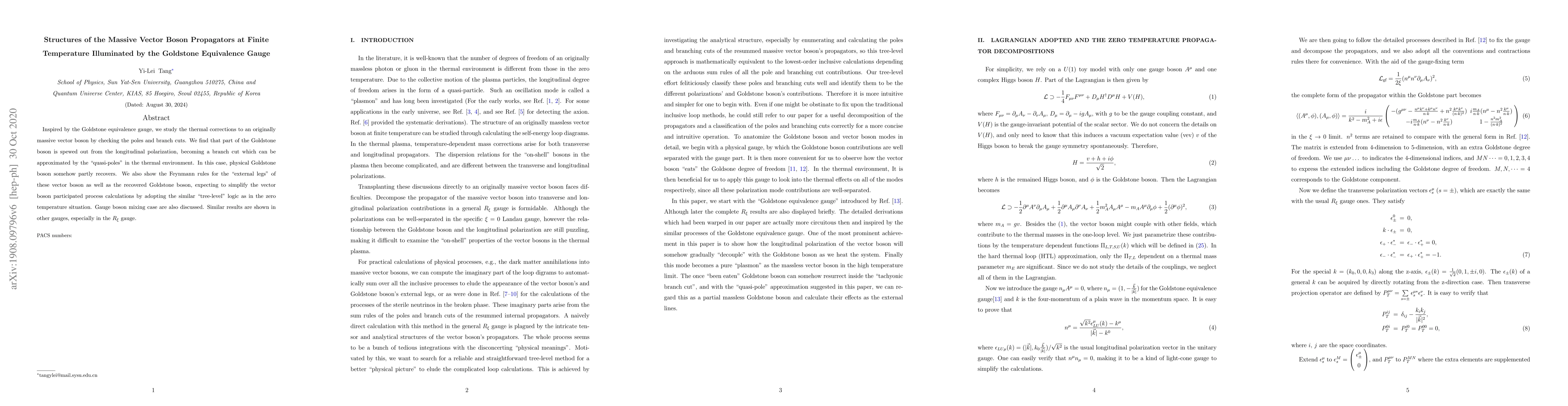 Inspired by the Goldstone equivalence gauge, we study the thermal corrections to an originally massive vector boson by checking the poles and branch cuts. We find that part of the Goldstone boson is spewed out from the longitudinal polarization, becoming a branch cut which can be approximated by the "quasi-poles" in the thermal environment. In this case, physical Goldstone boson somehow partly recovers. We also show the Feynmann rules for the "external legs" of these vector boson as well as the recovered Goldstone boson, expecting to simplify the vector boson participated process calculations by adopting the similar "tree-level" logic as in the zero temperature situation. Gauge boson mixing case are also discussed. Similar results are shown in other gauges, especially in the $R_\xi$ gauge.
