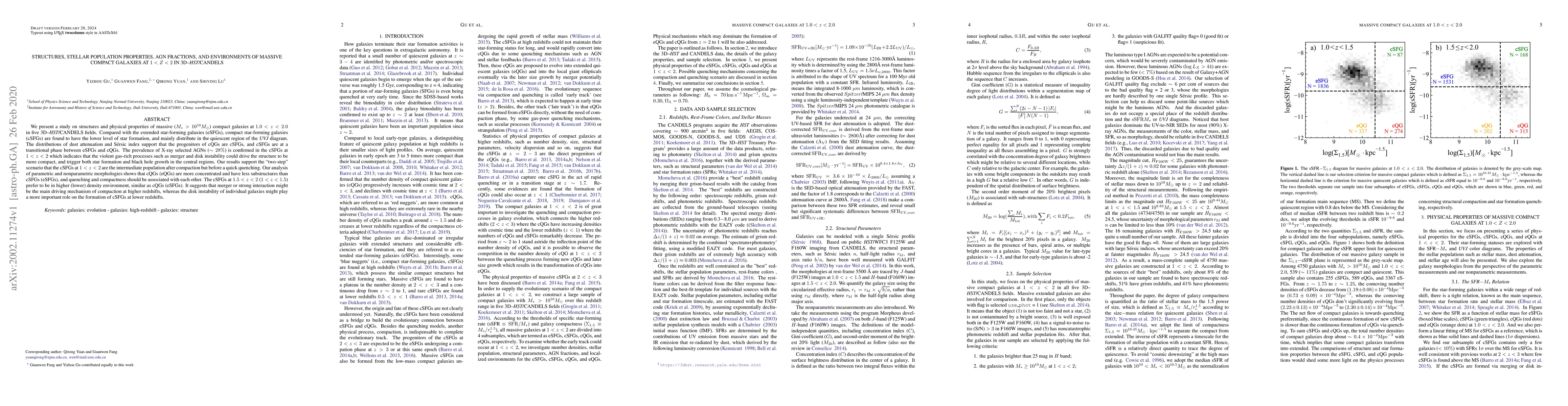 This study investigates the structures and properties of massive compact galaxies ($M_* > 10^{10} M_{\sun}$) at $1.0<z<2.0$ using the 3D-HST/CANDELS data. It finds that compact star-forming galaxies (cSFGs) exhibit lower star formation rates and are predominantly in quiescent regions, suggesting they are transitioning from extended star-forming galaxies (eSFGs) to compact quiescent galaxies (cQGs). The paper also confirms a high prevalence of AGNs in cSFGs, supporting the idea that gas-rich processes like mergers drive their compact structure and trigger both star formation and black hole growth.