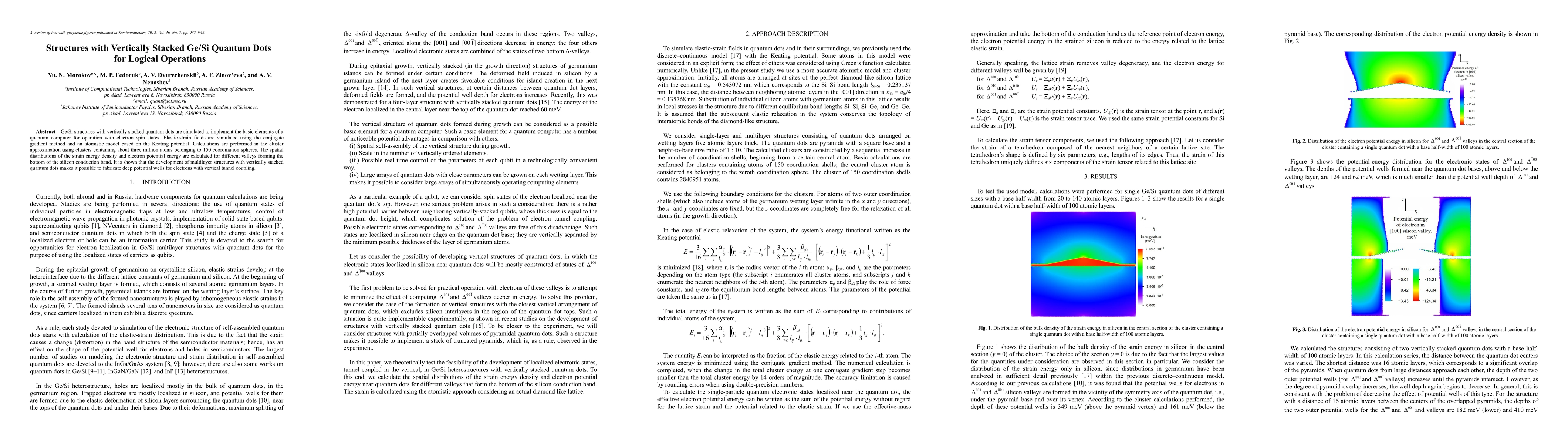 This paper simulates Ge/Si structures with vertically stacked quantum dots for quantum computing, employing elastic-strain fields and an atomistic model. It demonstrates that these structures can create deep potential wells for electron spin states, facilitating vertical tunnel coupling.