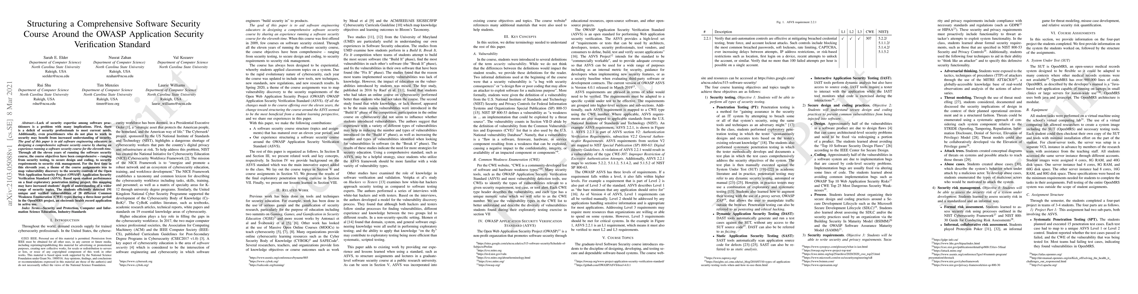 Lack of security expertise among software practitioners is a problem with many implications. First, there is a deficit of security professionals to meet current needs. Additionally, even practitioners who do not plan to work in security may benefit from increased understanding of security. The goal of this paper is to aid software engineering educators in designing a comprehensive software security course by sharing an experience running a software security course for the eleventh time. Through all the eleven years of running the software security course, the course objectives have been comprehensive - ranging from security testing, to secure design and coding, to security requirements to security risk management. For the first time in this eleventh year, a theme of the course assignments was to map vulnerability discovery to the security controls of the Open Web Application Security Project (OWASP) Application Security Verification Standard (ASVS). Based upon student performance on a final exploratory penetration testing project, this mapping may have increased students' depth of understanding of a wider range of security topics. The students efficiently detected 191 unique and verified vulnerabilities of 28 different Common Weakness Enumeration (CWE) types during a three-hour period in the OpenMRS project, an electronic health record application in active use.