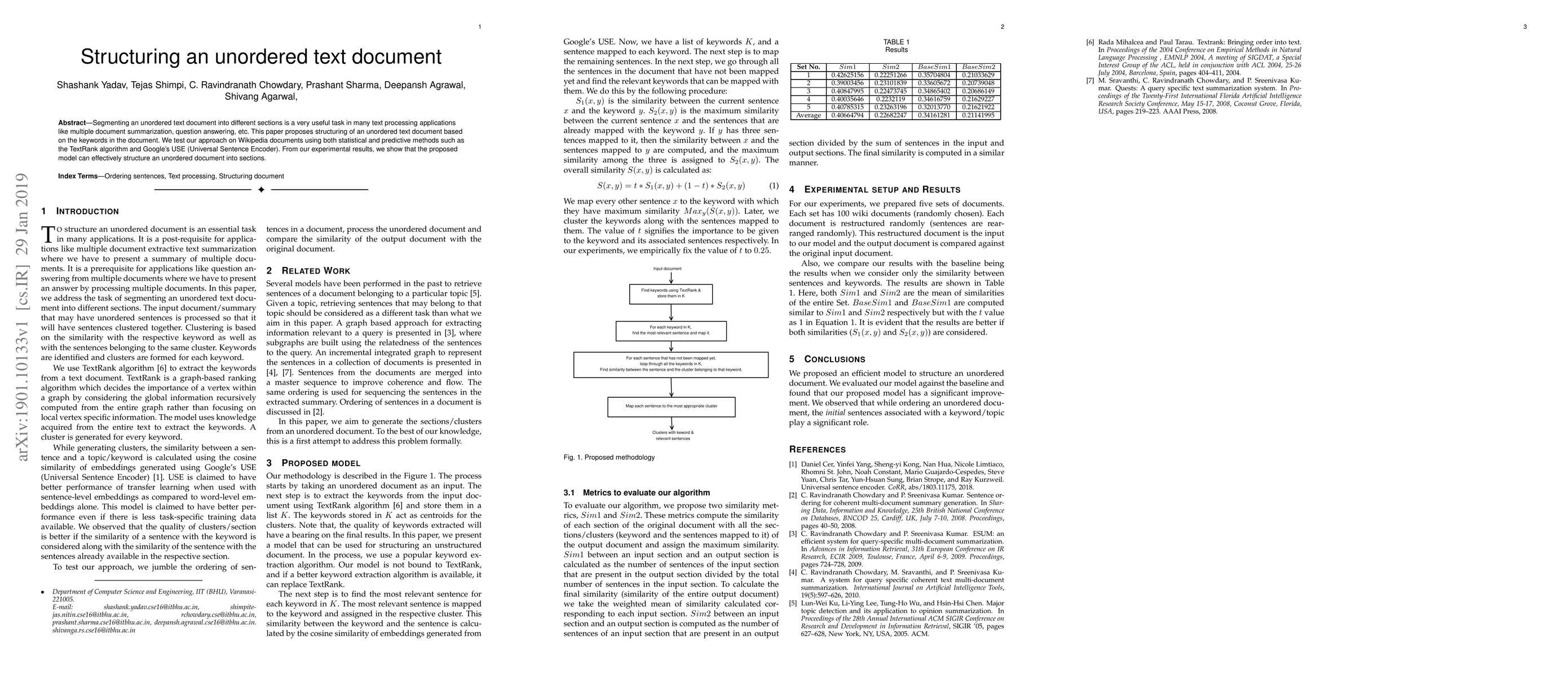 The paper proposes structuring an unordered text document into sections based on keywords using TextRank algorithm and Google's USE (Universal Sentence Encoder). Sentences are clustered based on similarity with respective keywords and sentences within the same cluster.