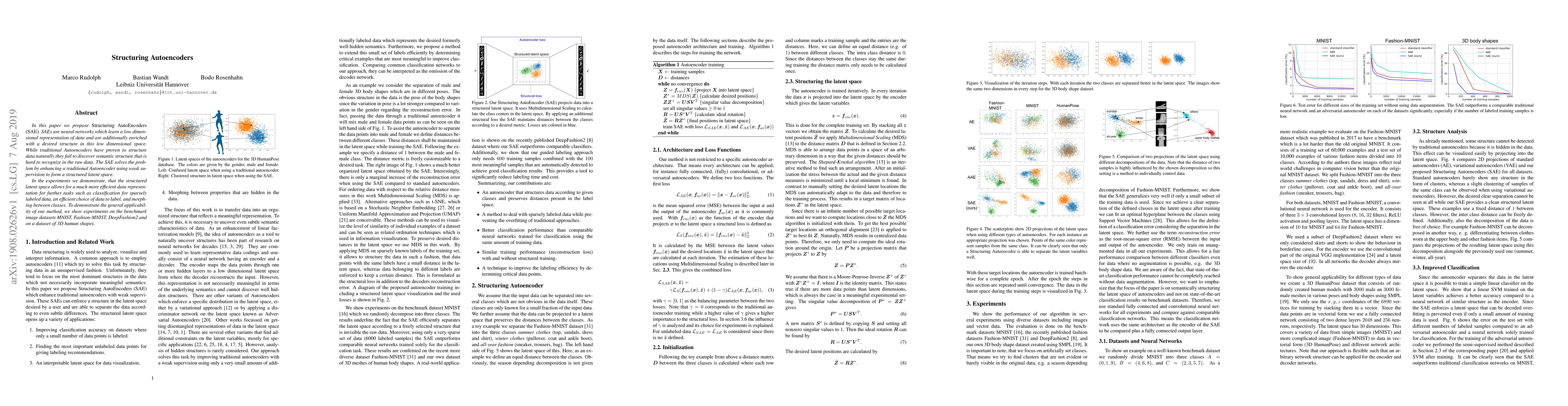 In this paper we propose Structuring AutoEncoders (SAE). SAEs are neural networks which learn a low dimensional representation of data which are additionally enriched with a desired structure in this low dimensional space. While traditional Autoencoders have proven to structure data naturally they fail to discover semantic structure that is hard to recognize in the raw data. The SAE solves the problem by enhancing a traditional Autoencoder using weak supervision to form a structured latent space. In the experiments we demonstrate, that the structured latent space allows for a much more efficient data representation for further tasks such as classification for sparsely labeled data, an efficient choice of data to label, and morphing between classes. To demonstrate the general applicability of our method, we show experiments on the benchmark image datasets MNIST, Fashion-MNIST, DeepFashion2 and on a dataset of 3D human shapes.