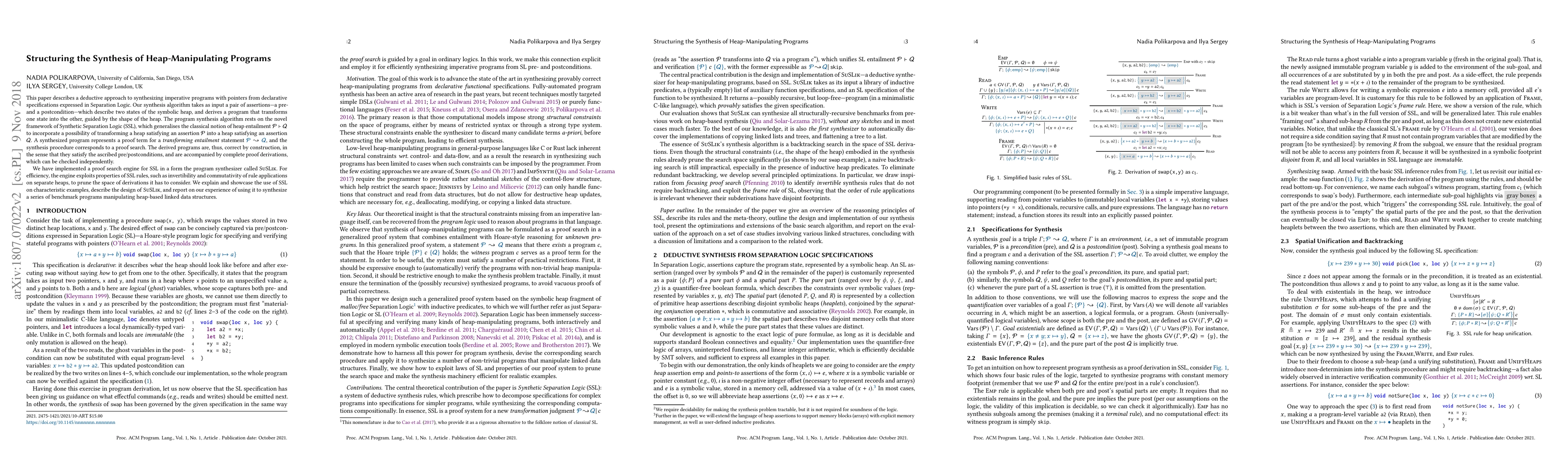 This paper presents a deductive synthesis method for imperative programs with pointers, using declarative specifications in Separation Logic. The synthesis algorithm, based on Synthetic Separation Logic, derives correct programs by construction, accompanied by verifiable proof derivations, and is implemented in the SuSLik synthesizer.