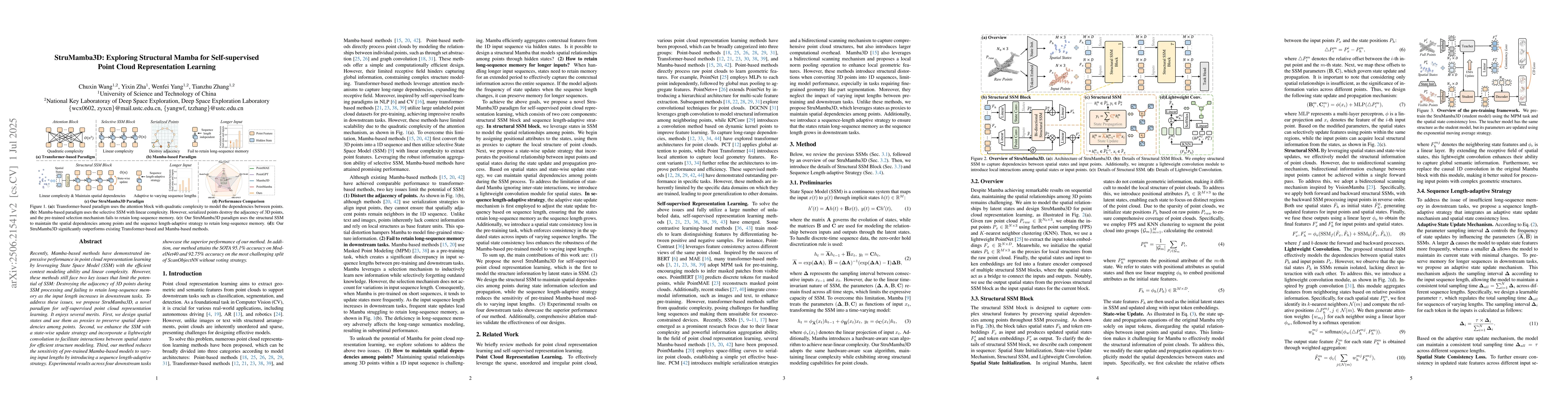 This work introduces a novel structural SSM framework tailored for point clouds, addressing adjacency distortion and long-sequence memory issues in Mamba-based models, and incorporates a sequence length-adaptive strategy for robustness across varying input sizes.