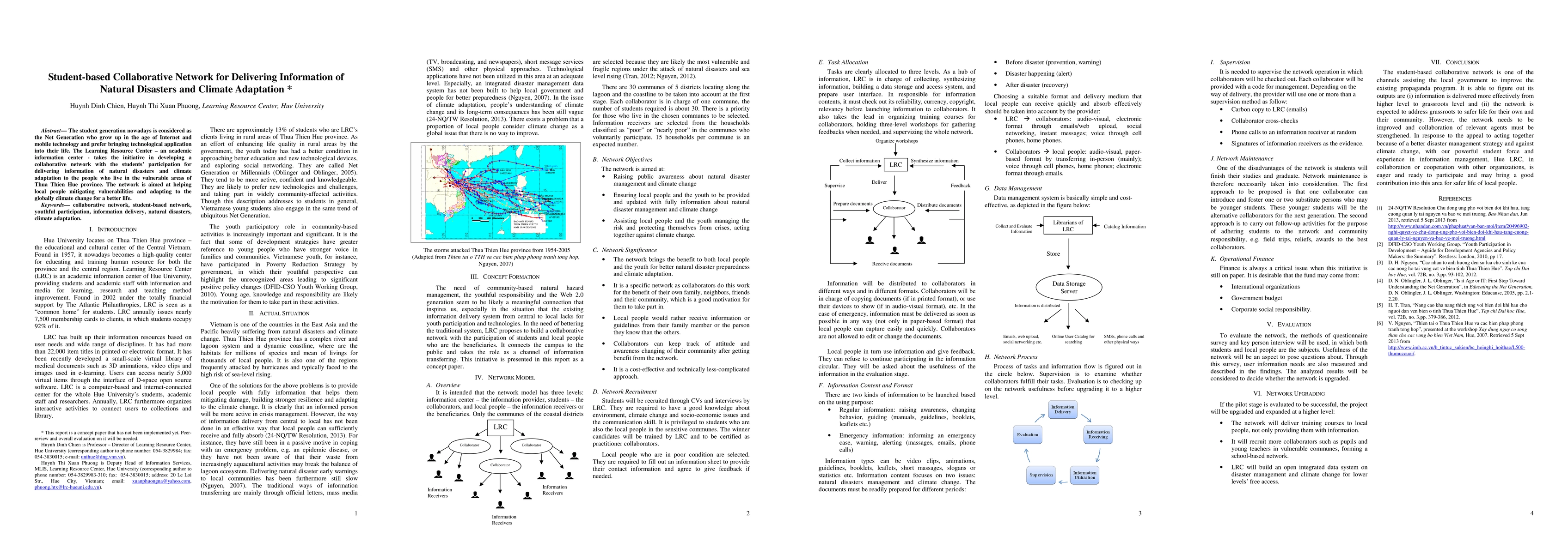 A student-based collaborative network was developed to provide information on natural disasters and climate adaptation to vulnerable communities in Thua Thien Hue province. The network aims to help local residents mitigate vulnerabilities and adapt to global climate change for a better life.