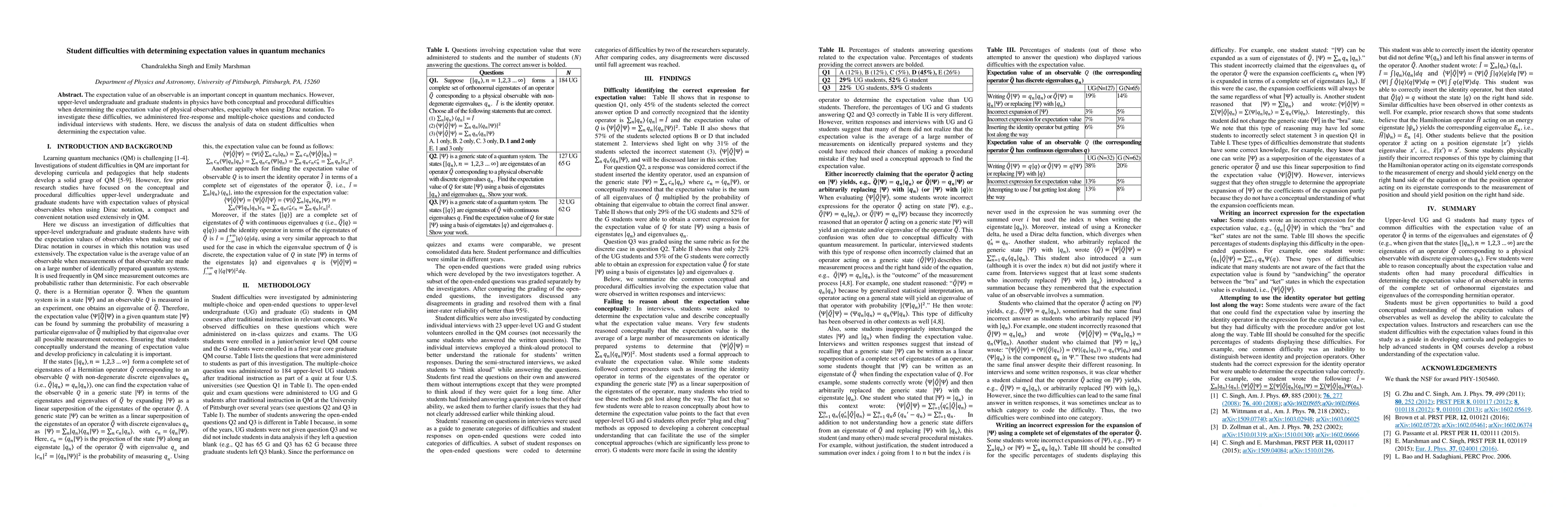 The expectation value of an observable is an important concept in quantum mechanics. However, upper-level undergraduate and graduate students in physics have both conceptual and procedural difficulties when determining the expectation value of physical observables, especially when using Dirac notation. To investigate these difficulties, we administered free-response and multiple-choice questions and conducted individual interviews with students. Here, we discuss the analysis of data on student difficulties when determining the expectation value.