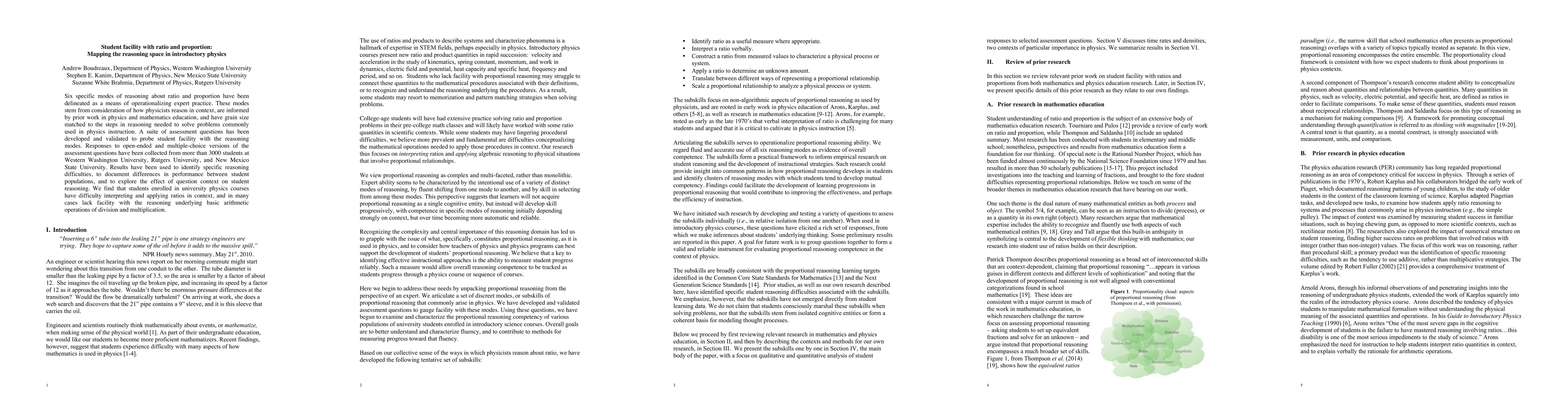 Six specific modes of reasoning about ratio and proportion have been delineated as a means of operationalizing expert practice. These modes stem from consideration of how physicists reason in context, are informed by prior work in physics and mathematics education, and have grain size matched to the steps in reasoning needed to solve problems commonly used in physics instruction. A suite of assessment questions has been developed and validated to probe student facility with the reasoning modes. Responses to open-ended and multiple-choice versions of the assessment questions have been collected from more than 3000 students at Western Washington University, Rutgers University, and New Mexico State University. Results have been used to identify specific reasoning difficulties, to document differences in performance between student populations, and to explore the effect of question context on student reasoning. We find that students enrolled in university physics courses have difficulty interpreting and applying ratios in context, and in many cases lack facility with the reasoning underlying basic arithmetic operations of division and multiplication.