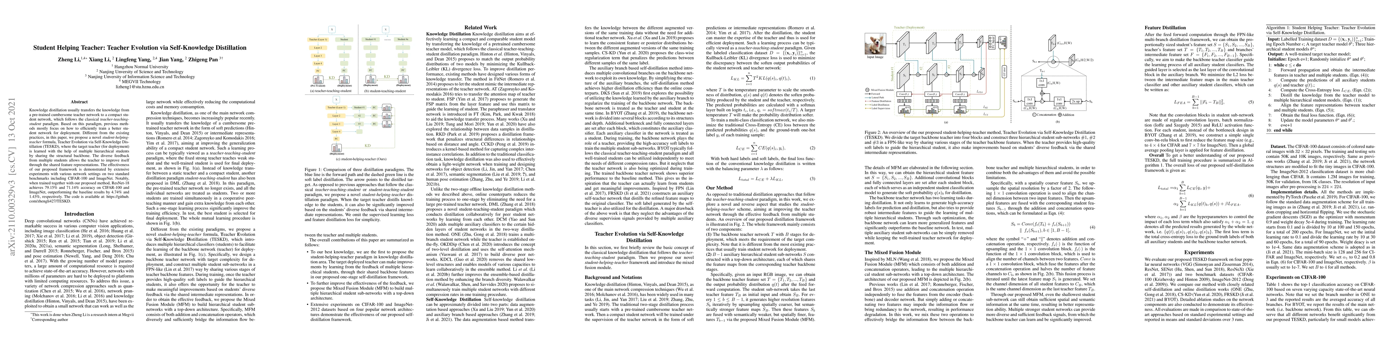 This paper introduces Teacher Evolution via Self-Knowledge Distillation (TESKD), a novel approach where multiple student networks help improve a teacher network through shared feature representations. The method achieves better performance on CIFAR-100 and ImageNet, outperforming baseline results.