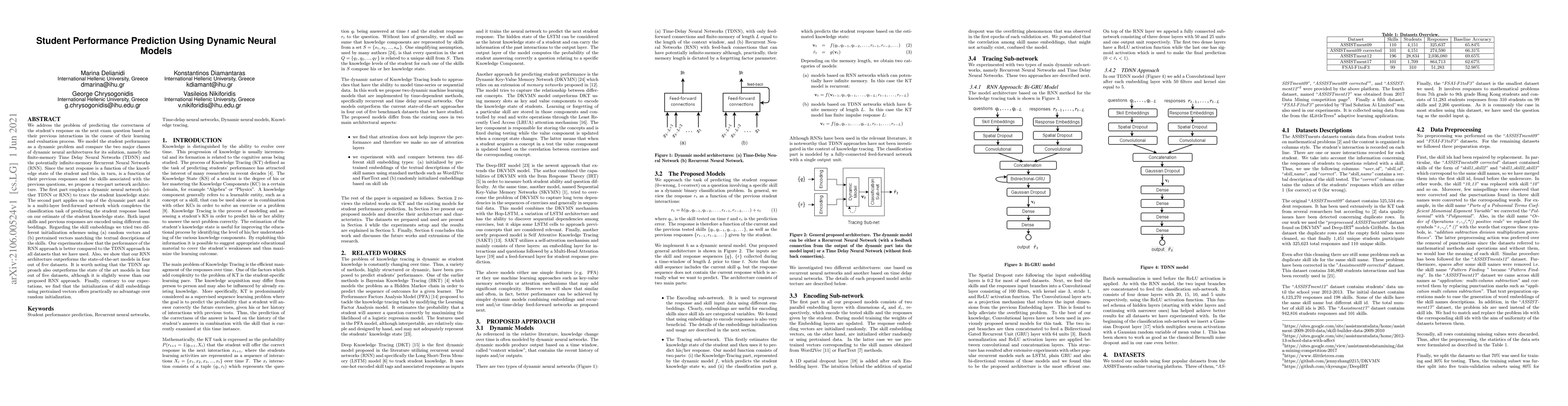 We address the problem of predicting the correctness of the student's response on the next exam question based on their previous interactions in the course of their learning and evaluation process. We model the student performance as a dynamic problem and compare the two major classes of dynamic neural architectures for its solution, namely the finite-memory Time Delay Neural Networks (TDNN) and the potentially infinite-memory Recurrent Neural Networks (RNN). Since the next response is a function of the knowledge state of the student and this, in turn, is a function of their previous responses and the skills associated with the previous questions, we propose a two-part network architecture. The first part employs a dynamic neural network (either TDNN or RNN) to trace the student knowledge state. The second part applies on top of the dynamic part and it is a multi-layer feed-forward network which completes the classification task of predicting the student response based on our estimate of the student knowledge state. Both input skills and previous responses are encoded using different embeddings. Regarding the skill embeddings we tried two different initialization schemes using (a) random vectors and (b) pretrained vectors matching the textual descriptions of the skills. Our experiments show that the performance of the RNN approach is better compared to the TDNN approach in all datasets that we have used. Also, we show that our RNN architecture outperforms the state-of-the-art models in four out of five datasets. It is worth noting that the TDNN approach also outperforms the state of the art models in four out of five datasets, although it is slightly worse than our proposed RNN approach. Finally, contrary to our expectations, we find that the initialization of skill embeddings using pretrained vectors offers practically no advantage over random initialization.
