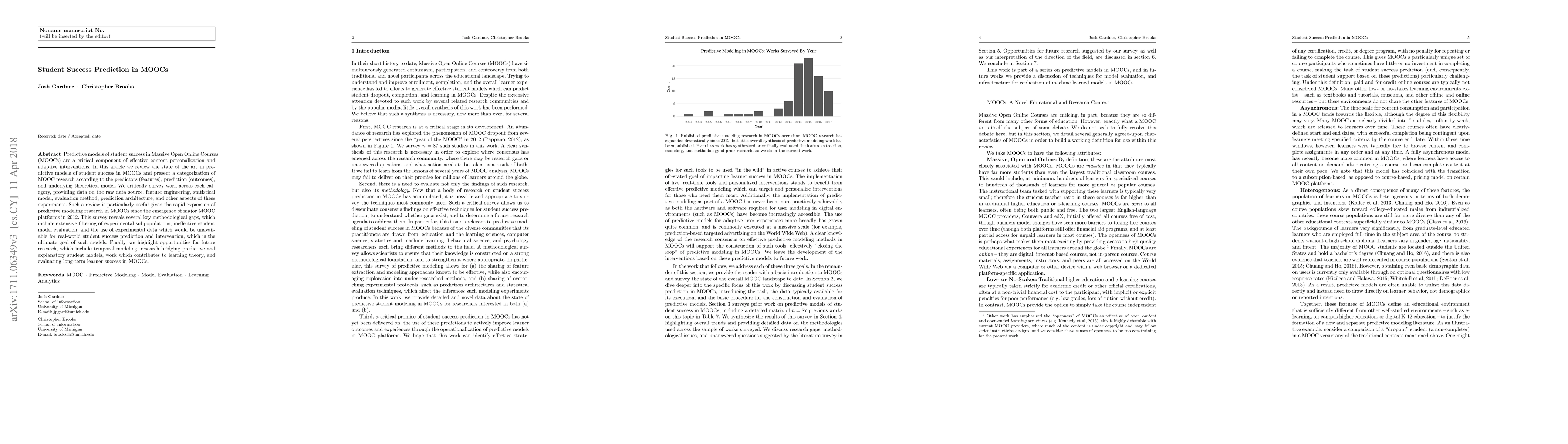 This paper reviews predictive models for student success in MOOCs, categorizing research by predictors, outcomes, and theoretical models, and identifies key methodological gaps and opportunities for future research, including temporal modeling and long-term success evaluation.