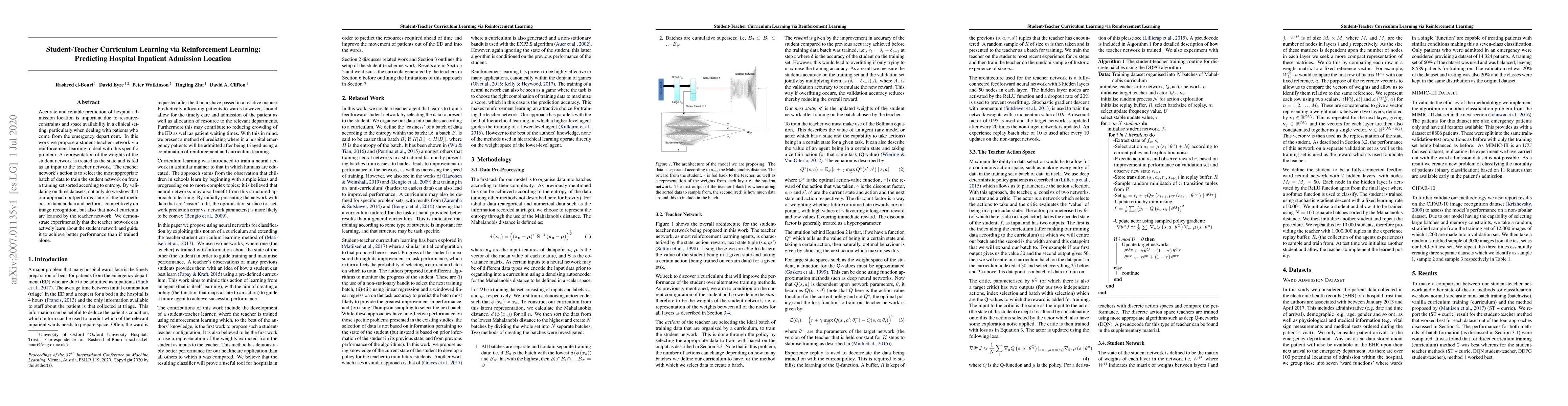 Accurate and reliable prediction of hospital admission location is important due to resource-constraints and space availability in a clinical setting, particularly when dealing with patients who come from the emergency department. In this work we propose a student-teacher network via reinforcement learning to deal with this specific problem. A representation of the weights of the student network is treated as the state and is fed as an input to the teacher network. The teacher network's action is to select the most appropriate batch of data to train the student network on from a training set sorted according to entropy. By validating on three datasets, not only do we show that our approach outperforms state-of-the-art methods on tabular data and performs competitively on image recognition, but also that novel curricula are learned by the teacher network. We demonstrate experimentally that the teacher network can actively learn about the student network and guide it to achieve better performance than if trained alone.