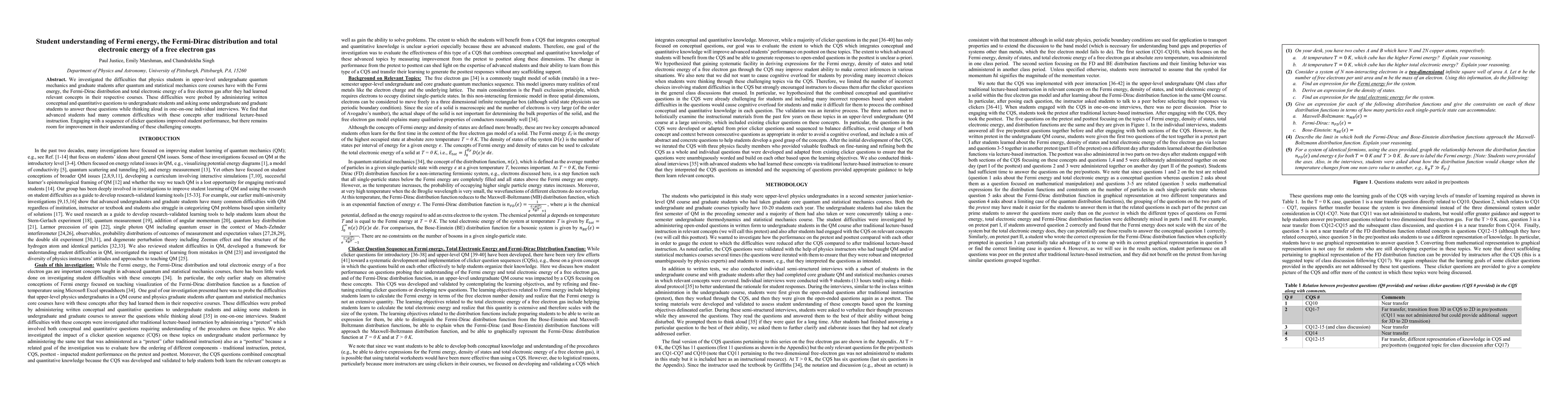 We investigated the difficulties that physics students in upper-level undergraduate quantum mechanics and graduate students after quantum and statistical mechanics core courses have with the Fermi energy, the Fermi-Dirac distribution and total electronic energy of a free electron gas after they had learned relevant concepts in their respective courses. These difficulties were probed by administering written conceptual and quantitative questions to undergraduate students and asking some undergraduate and graduate students to answer those questions while thinking aloud in one-on-one individual interviews. We find that advanced students had many common difficulties with these concepts after traditional lecture-based instruction. Engaging with a sequence of clicker questions improved student performance, but there remains room for improvement in their understanding of these challenging concepts.