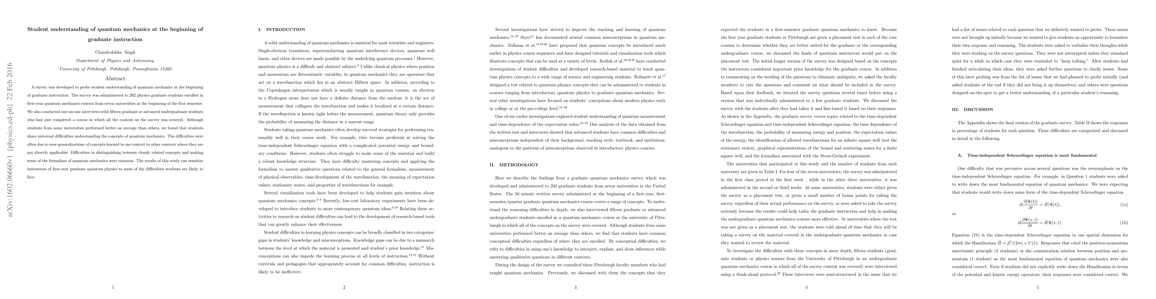 This study surveyed 202 first-year graduate physics students' initial understanding of quantum mechanics, revealing universal difficulties, particularly in distinguishing related concepts and applying learned concepts inappropriately. The findings highlight common challenges that can inform first-year graduate quantum physics instruction.