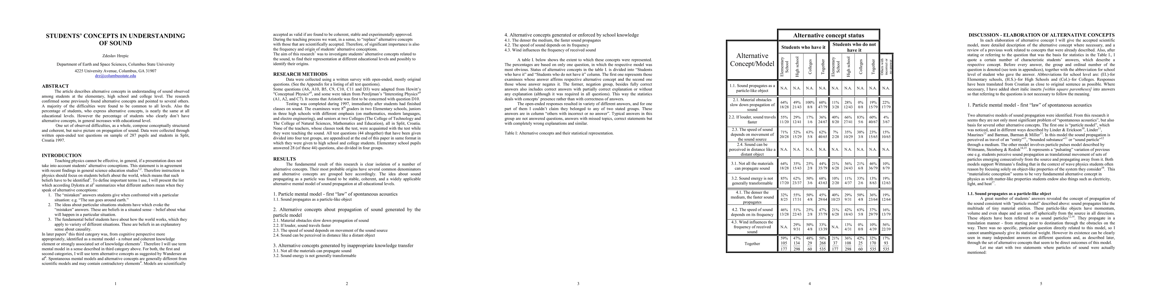 The article describes alternative concepts in understanding of sound observed among students at the elementary, high school and college level. The research confirmed some previously found alternative concepts and pointed to several others. A majority of the difficulties were found to be common to all levels. Also the percentage of students, who express alternative concepts, is nearly the same at all educational levels. However the percentage of students who clearly don't have alternative concepts, in general increases with educational level. One set of observed difficulties, as a whole, compose conceptually structured and coherent, but naive picture on propagation of sound. Data were collected through written open-ended test questions on sample of 287 pupils and students in Split, Croatia 1997.