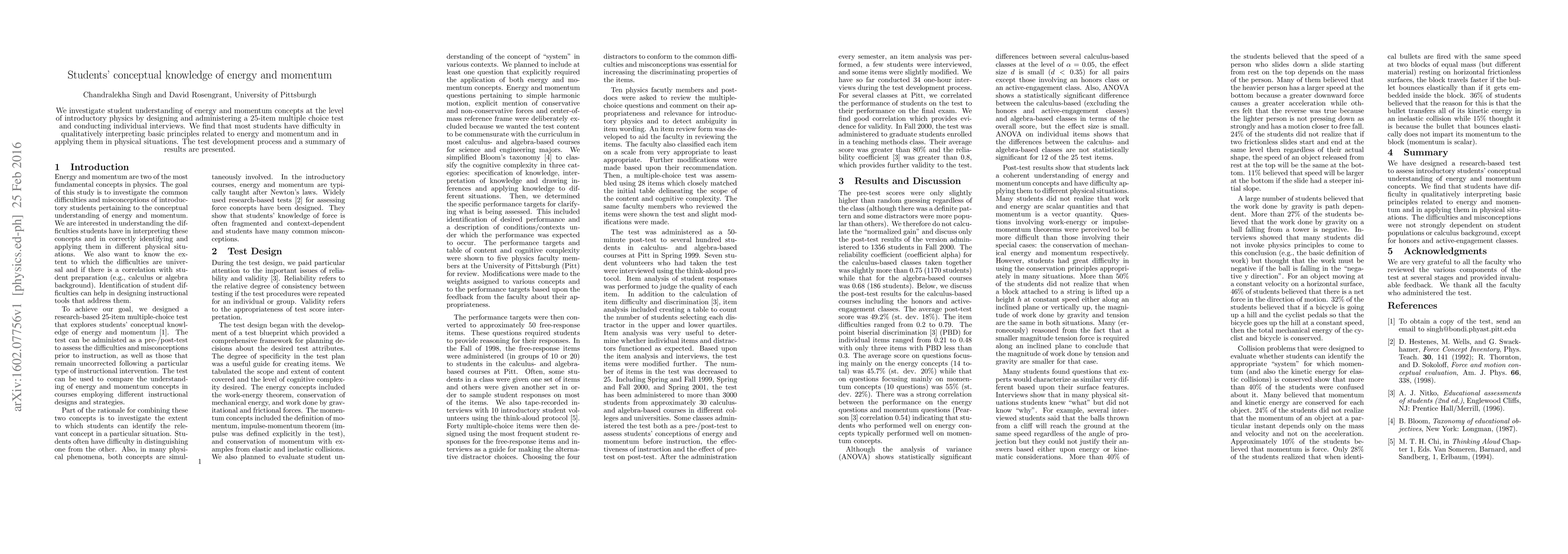 We investigate student understanding of energy and momentum concepts at the level of introductory physics by designing and administering a 25-item multiple choice test and conducting individual interviews. We find that most students have difficulty in qualitatively interpreting basic principles related to energy and momentum and in applying them in physical situations. The test development process and a summary of results are presented.