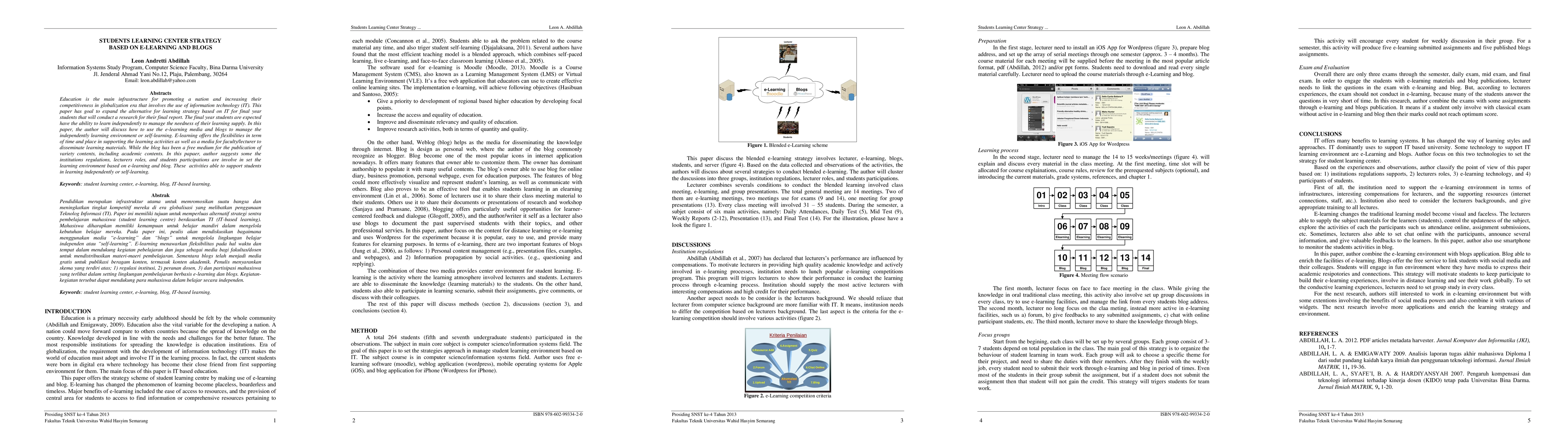 This paper explores using e-learning and blogs to support final year students in learning independently for their research reports. It proposes institutions' regulations, lecturers' roles, and student participation to set up a self-learning environment.