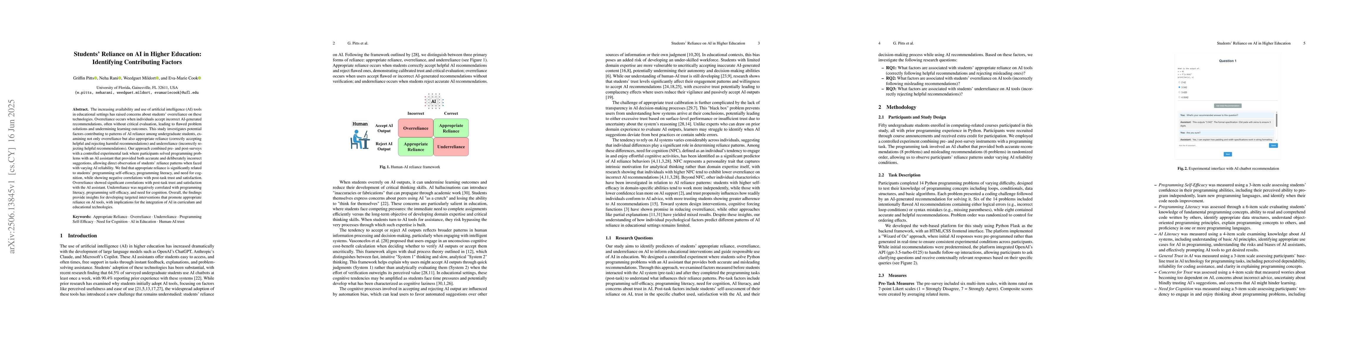 The increasing availability and use of artificial intelligence (AI) tools in educational settings has raised concerns about students' overreliance on these technologies. Overreliance occurs when individuals accept incorrect AI-generated recommendations, often without critical evaluation, leading to flawed problem solutions and undermining learning outcomes. This study investigates potential factors contributing to patterns of AI reliance among undergraduate students, examining not only overreliance but also appropriate reliance (correctly accepting helpful and rejecting harmful recommendations) and underreliance (incorrectly rejecting helpful recommendations). Our approach combined pre- and post-surveys with a controlled experimental task where participants solved programming problems with an AI assistant that provided both accurate and deliberately incorrect suggestions, allowing direct observation of students' reliance patterns when faced with varying AI reliability. We find that appropriate reliance is significantly related to students' programming self-efficacy, programming literacy, and need for cognition, while showing negative correlations with post-task trust and satisfaction. Overreliance showed significant correlations with post-task trust and satisfaction with the AI assistant. Underreliance was negatively correlated with programming literacy, programming self-efficacy, and need for cognition. Overall, the findings provide insights for developing targeted interventions that promote appropriate reliance on AI tools, with implications for the integration of AI in curriculum and educational technologies.