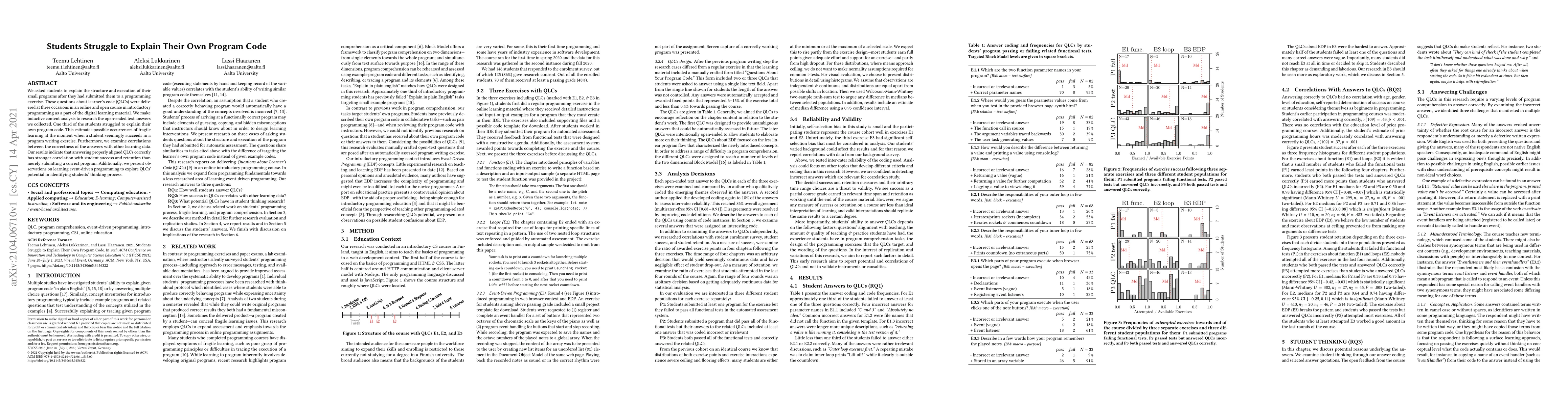 One-third of students had difficulty explaining their own program code, indicating fragile learning despite apparent success in programming exercises. Correctly answering questions about their code correlated more strongly with student success and retention than merely submitting correct programs.