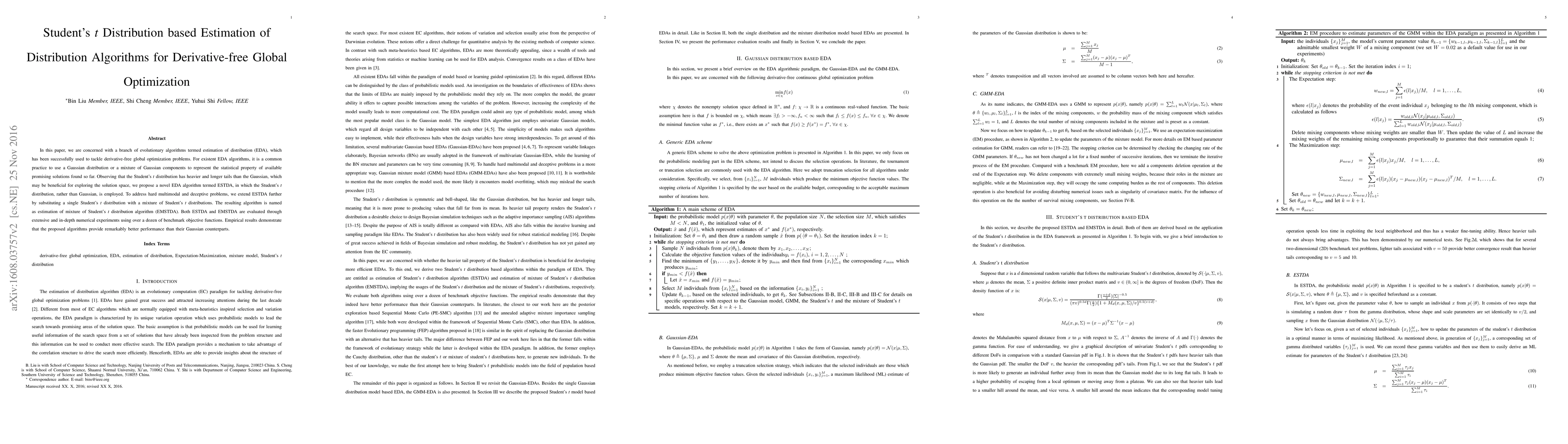 In this paper, we are concerned with a branch of evolutionary algorithms termed estimation of distribution (EDA), which has been successfully used to tackle derivative-free global optimization problems. For existent EDA algorithms, it is a common practice to use a Gaussian distribution or a mixture of Gaussian components to represent the statistical property of available promising solutions found so far. Observing that the Student's t distribution has heavier and longer tails than the Gaussian, which may be beneficial for exploring the solution space, we propose a novel EDA algorithm termed ESTDA, in which the Student's t distribution, rather than Gaussian, is employed. To address hard multimodal and deceptive problems, we extend ESTDA further by substituting a single Student's t distribution with a mixture of Student's t distributions. The resulting algorithm is named as estimation of mixture of Student's t distribution algorithm (EMSTDA). Both ESTDA and EMSTDA are evaluated through extensive and in-depth numerical experiments using over a dozen of benchmark objective functions. Empirical results demonstrate that the proposed algorithms provide remarkably better performance than their Gaussian counterparts.