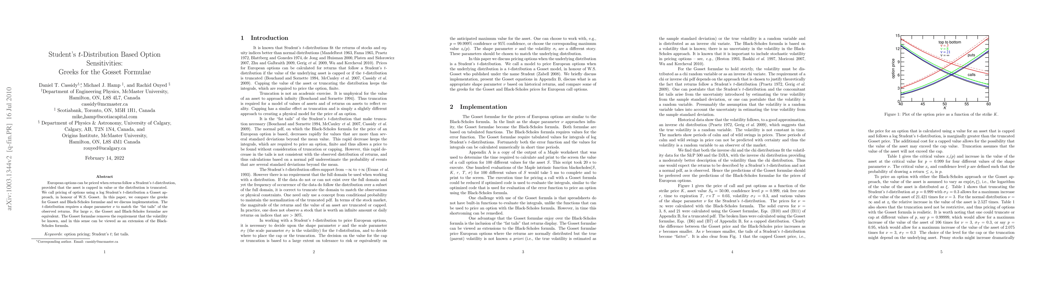 European options can be priced when returns follow a Student's t-distribution, provided that the asset is capped in value or the distribution is truncated. We call pricing of options using a log Student's t-distribution a Gosset approach, in honour of W.S. Gosset. In this paper, we compare the greeks for Gosset and Black-Scholes formulae and we discuss implementation. The t-distribution requires a shape parameter \nu to match the "fat tails" of the observed returns. For large \nu, the Gosset and Black-Scholes formulae are equivalent. The Gosset formulae removes the requirement that the volatility be known, and in this sense can be viewed as an extension of the Black-Scholes formula.